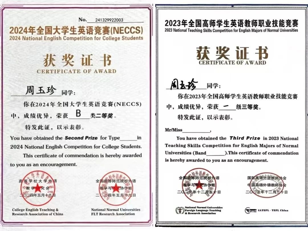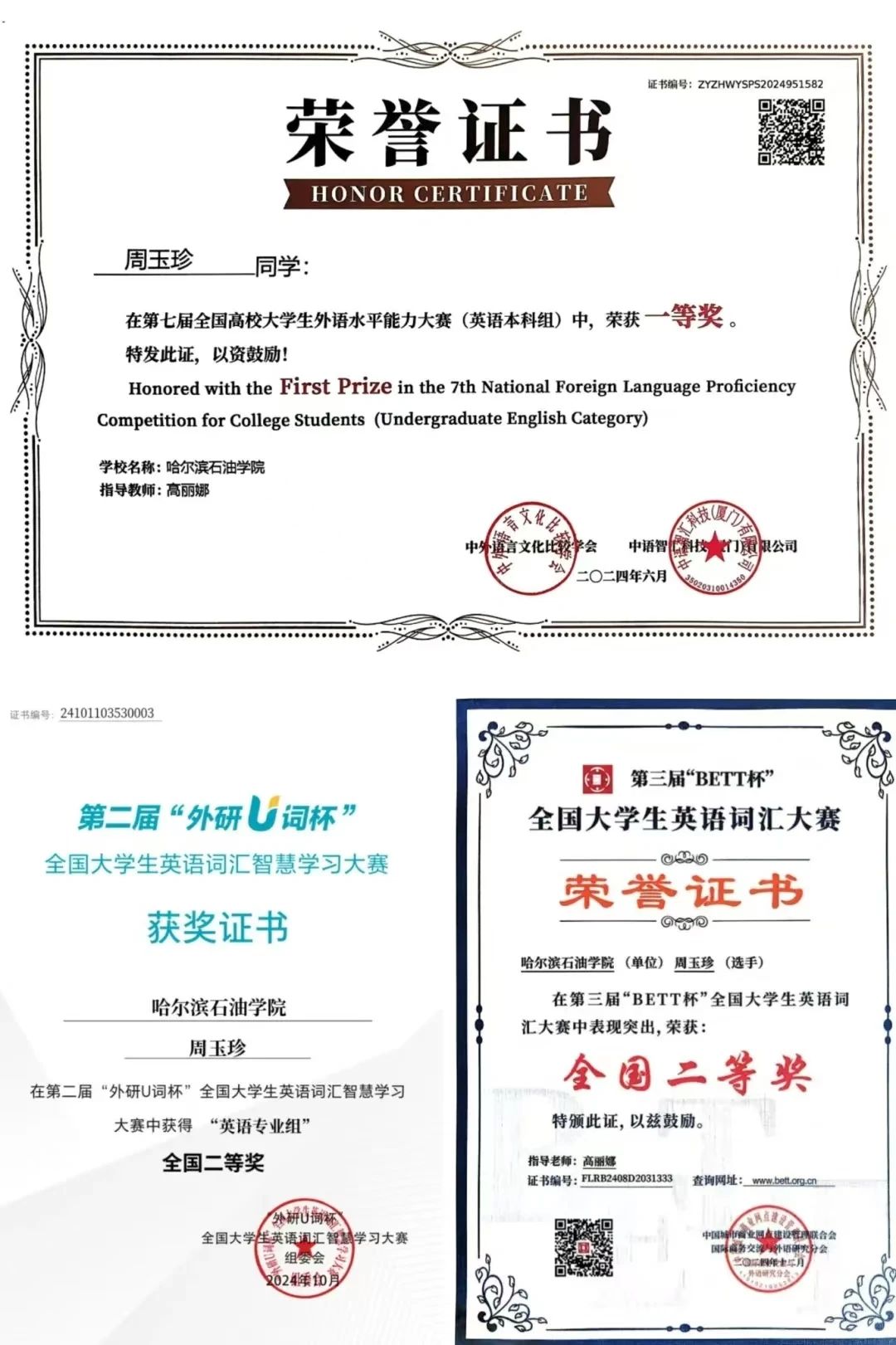 周玉珍作为我院学生的优秀代表,始终以卓越的表现诠释着外院学子的风采。她是国家级奖学金“大满贯”获得者,多次获评国家奖学金、国家励志奖学金。在学术竞赛领域,她更是成绩斐然,累计获得7项国家级学术竞赛奖项、1项省部级奖项及12项校级荣誉。在第七届全国大学生外语水平能力大赛、全国大学生英语词汇智慧学习大赛、全国创新创业能力大赛、高校文化强国杯挑战赛、全国职业发展大赛均荣获一等奖!她在外语能力、职业规划、创新创业、跨文化研究等多个领域全面发展,成为当之无愧的“全能型学术新星”。