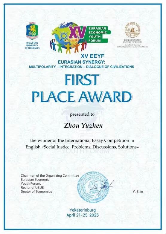 2025年4月22日,第十五届欧亚青年经济论坛(EEFM)在俄罗斯叶卡捷琳堡市国际展览中心盛大开幕。在备受瞩目的国际英语征文竞赛中,我院英语专业2022级一班学生周玉珍凭借其极具深度的学术文章《斯大林格勒战役:历史正义与记忆重构的全球启示》,在来自中俄及欧亚多国的千余名青年精英中崭露头角,一举荣膺中国区第一名!校长王义宁教授受邀出席论坛并亲自为周玉珍颁发冠军证书。这一优异成绩的取得,不仅是周玉珍同学个人学术实力的精彩展现,更是外国语学院在国际化人才培养方面的又一重大突破。