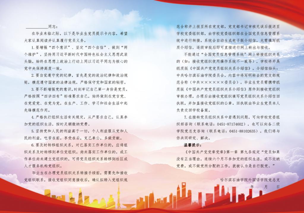 大会第二项,外国语学院党总支向全体毕业生党员推送了“毕业生党员提示卡”。这张小小的提示卡,承载着学院党委对毕业生党员的关怀与期望,提示卡的及时推送,第一时间为毕业生党员们提供了精准而又详细地指导,让毕业生党员清楚地了解组织关系转接的整体流程和注意事项,确保每一位毕业生党员在离校后都能按照规定顺利纳入组织管理。