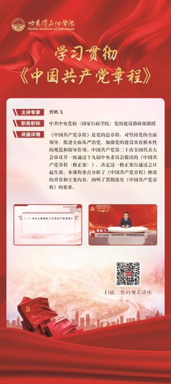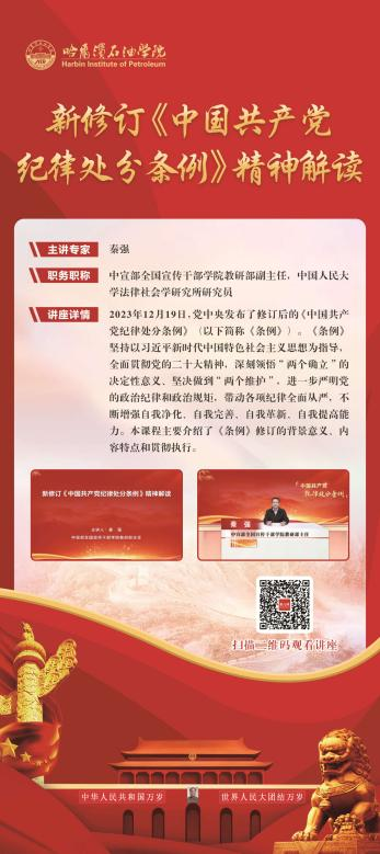 为深入学习贯彻习近平总书记关于加强党的纪律建设的重要论述,推动党纪学习教育走深走实,教育引导党员干部学纪、知纪、明纪、守纪,机关第三党支部整合图书馆的数据库课程资源,在图书馆大厅举办党纪学习教育主题课程展,本次展览共展出由全国优秀思政课专家讲授的《习近平文化思想》、《中国共产党纪律处分条例解读》、《对违反廉洁纪律行为的处分》、《学习贯彻中国共产党章程》等十门精品课程,广大师生可通过扫描展板上的二维码,观看党纪主题教育相关课程。