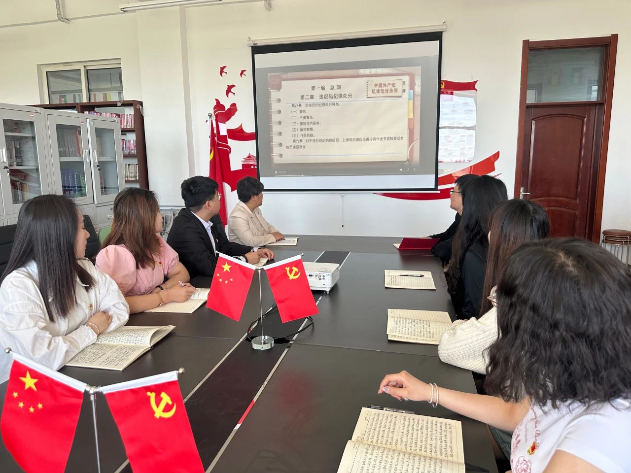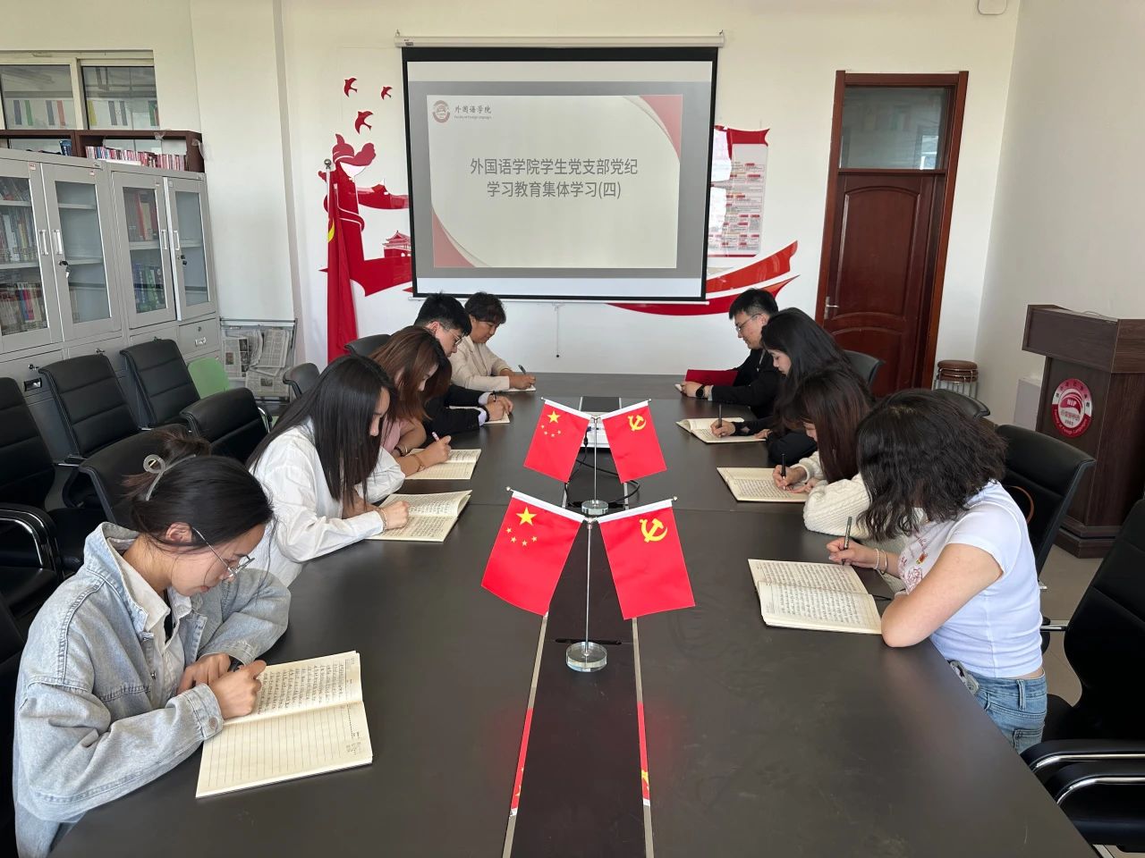 为推动党纪学习教育走深走实,营造良好舆论氛围,引导学生党员进一步学纪、知纪、明纪、守纪,外国语学院学生党支部于5月16日开展新修订的《中国共产党纪律处分条例》第四次集中学习,引导广大学生党员树牢责任意识、底线意识、纪律意识,扎实开展党规党纪学习教育,进一步增强我院学生党员的纪律意识和规矩意识。外国语学院学生党支部书记赵连琦、辅导员郑智慧、外国语学院全体学生党员参加会议。