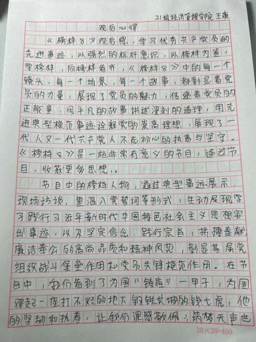 通过《榜样8》的专题学习,我院师生党员深刻认识到,作为一名共产党员,要时刻牢记自己的初心和使命,始终保持对党和人民的忠诚。同时,也给我们提供了很好的学习范例,我们要以这些榜样为镜,对照自己的工作和思想,查找不足和差距,并从中汲取力量,坚定理想信念,践行宗旨使命,不断提升自身素质和能力,为党和人民的事业贡献自己的力量,为实现中华民族伟大复兴的中国梦而不懈奋斗!