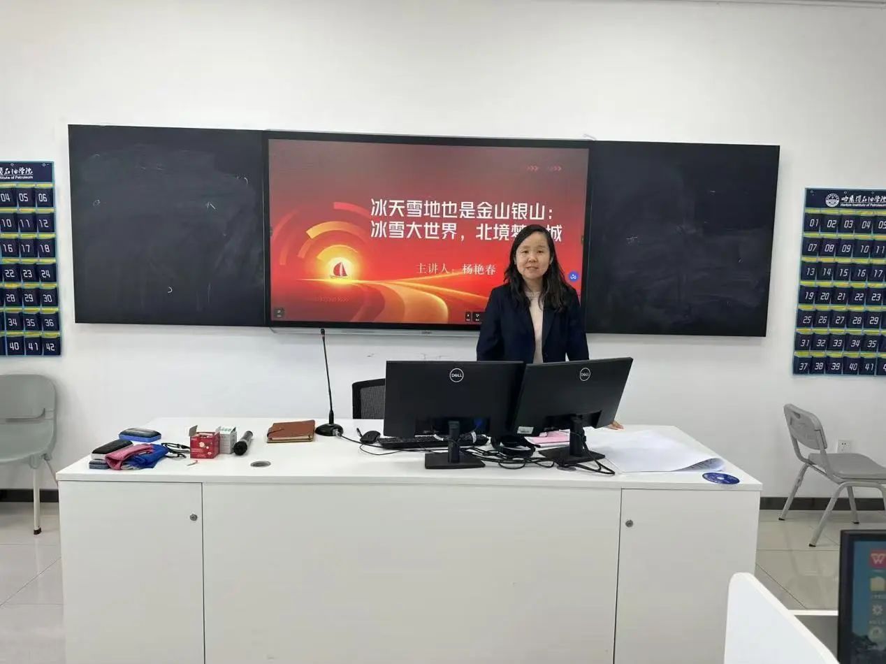 邹丹老师以《龙江人物—铁人王进喜》为题,用英语生动还原了"铁人"带领团队攻克技术难关的奋斗历程,强调"有条件要上,没有条件创造条件也要上"的铁人精神。