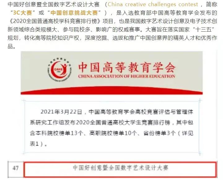 中国好创意暨全国数字艺术设计大赛,是入选教育部中国高等教育学会发布的《2020 全国普通高校学科竞赛排行榜》 项目,也是我国数字艺术设计创意及电子技术创新领域综合类规模大、参赛院校多、影响范围广的权威赛事。由于活动鼓励原创、激发创新思维,展示艺术与科技创新最新成果,传播数字艺术设计、电子科技创新和产学研融合的最新理念,所以全国各所高校参与意愿较高。