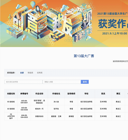 同时,在本届大广赛省赛角逐中,学院学生也取得了突出的成绩,在各个组别的竞争中,取得了二等奖一个,三等奖六个,优秀奖七个,为学院参赛史上的获奖人数及作品最多的一届。