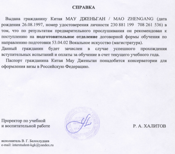 大学四年的学习时光里,他每日刻苦练习歌唱,励志报考国外音乐学院,攻读硕士学位。经过四年来的不懈努力,2021年5月经过喀山国立音乐学院声乐系委员会全体委员审查毛振刚的演唱曲目,学院专家给予了较高的评价,一致同意录取毛振刚进入学校继续攻读硕士学位。