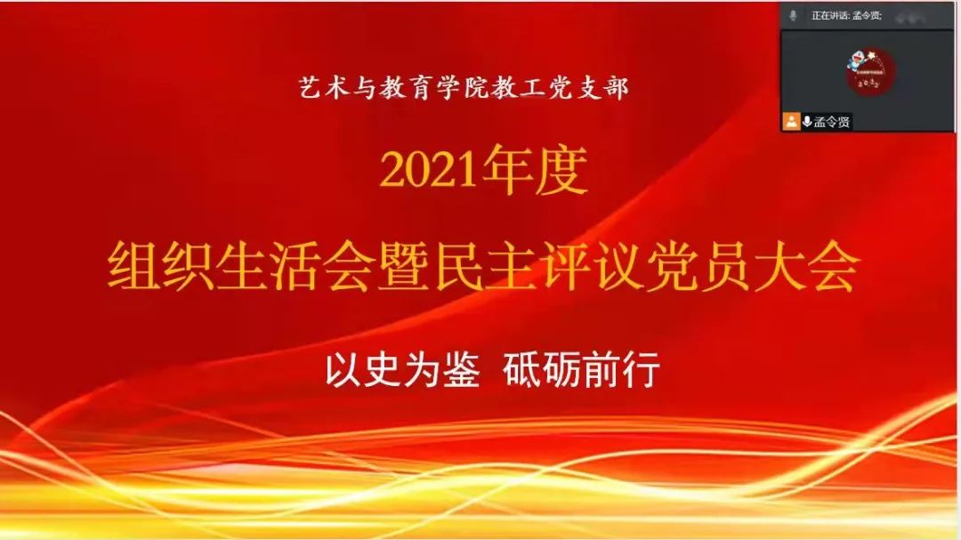 为深入学习贯彻习近平新时代中国特色社会主义思想,学习贯彻党的十九届六中全会精神,根据校党委工作安排,艺术与教育学院教工党支部于3月23日召开2022年“以史为鉴 砥砺前行”专题组织生活会暨民主评议大会,支部全体党员参加会议,会议由教工党支部书记孟令贤主持。