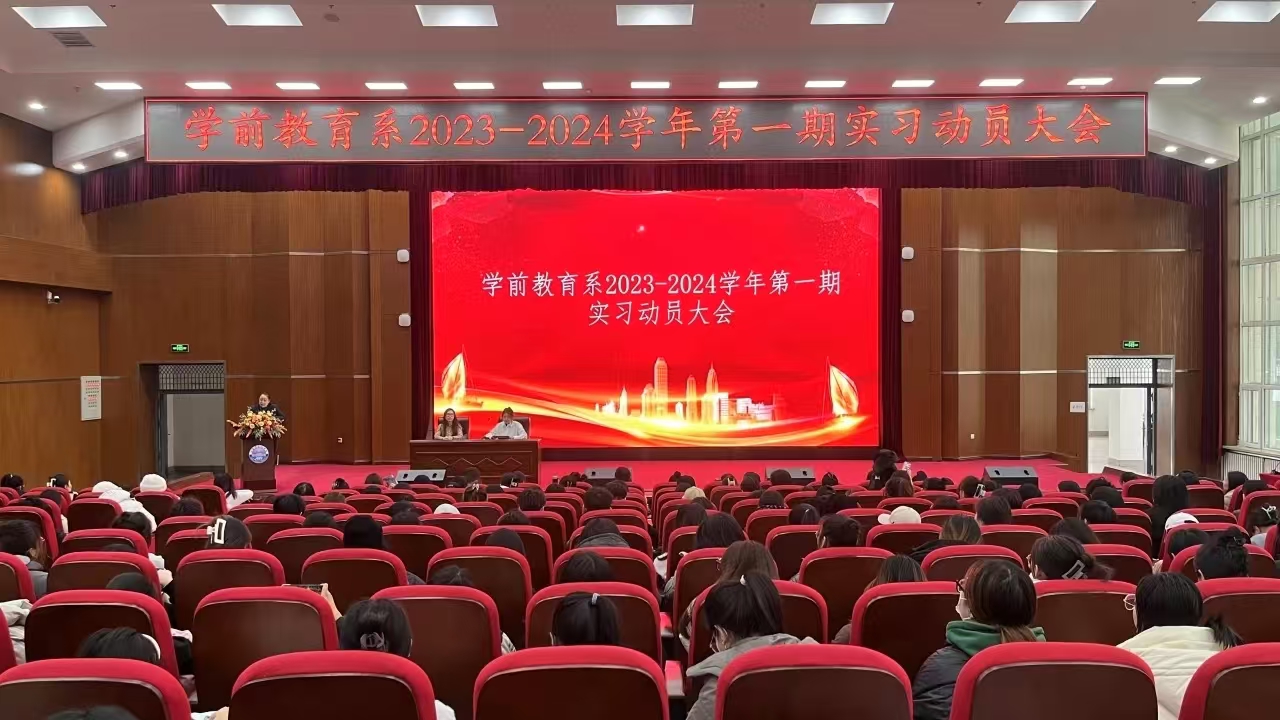 实习是大学生巩固所学知识、积累初步工作经验的重要环节,也是对理论知识的实践应用。为了使即将实习的2021、2022级学生充分认识到实习对于积累教育实践经验的重要性和必要性,以饱满的热情投入到实习工作中,确保学院实习工作有序开展,艺术与教育学院于2023年12月8日在图书馆报告厅组织召开了学前教育系2023-2024学年度第一学期实习动员大会。学前教育系主任高馨月、2021级辅导员辛静雯、郭雪梅,2022级辅导员孙宁、学前教育系全体教师及2021、2022级全体学生参加会议。