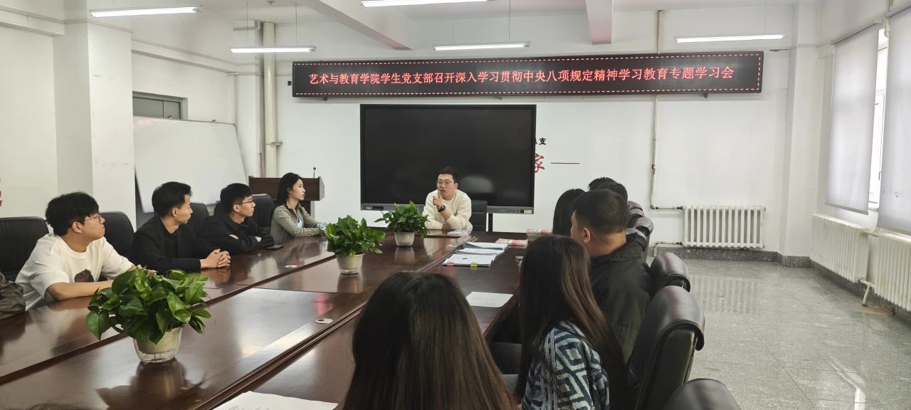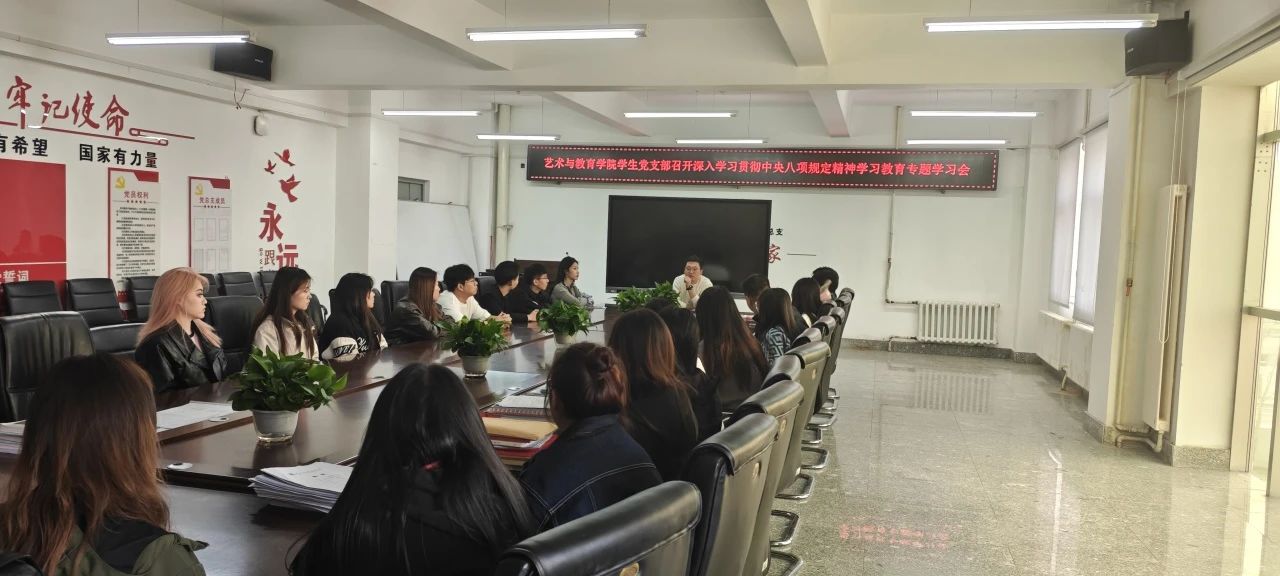 为学习贯彻习近平总书记关于深入贯彻中央八项规定精神学习教育的重要讲话和重要指示精神,加强党员作风建设,筑牢思想防线,4月22日,艺术与教育学院学生党支部召开深入学习贯彻中央八项规定精神学习教育专题学习会,会议由学生党支部书记贾延迪主持,全体学生党员参会学习。