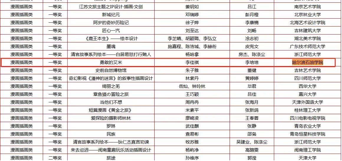 作为入选教育部中国高等教育学会发布的《全国普通高校学科竞赛排行榜》赛事,我院非常重视好创意大赛的筹备工作,从年初开始组织师生进行针对性准备。同时伟德官网作为今年的主要承办单位也用优质的服务支持大赛更好的为龙江设计类作品推优出新。入围国赛的所有作品均为省赛专家多轮次遴选推荐而成,由此可见竞争非常激烈。本届国赛获奖作品分别是动画专业教师李培培指导的漫画作品《勇敢的艾米》荣获大赛漫画插画类一等奖;广播电视编导专业教师王原、花瑞洁分别指导的交通艺术设计类作品《落日余晖中的城市动脉》、短视频类作品《风起时》获得三等奖;动画专业教师李莹指导的作品《衍化》获得漫画插画类三等奖;学前教育专业教师刘雪与动画专业教师李懿人联合指导作品《筑梦冰城,一起向未来》获得视觉传达类三等奖;数字媒体艺术专业教师张弛指导的作品《铜人旁的岁月凝思》获得数字摄影类三等奖。