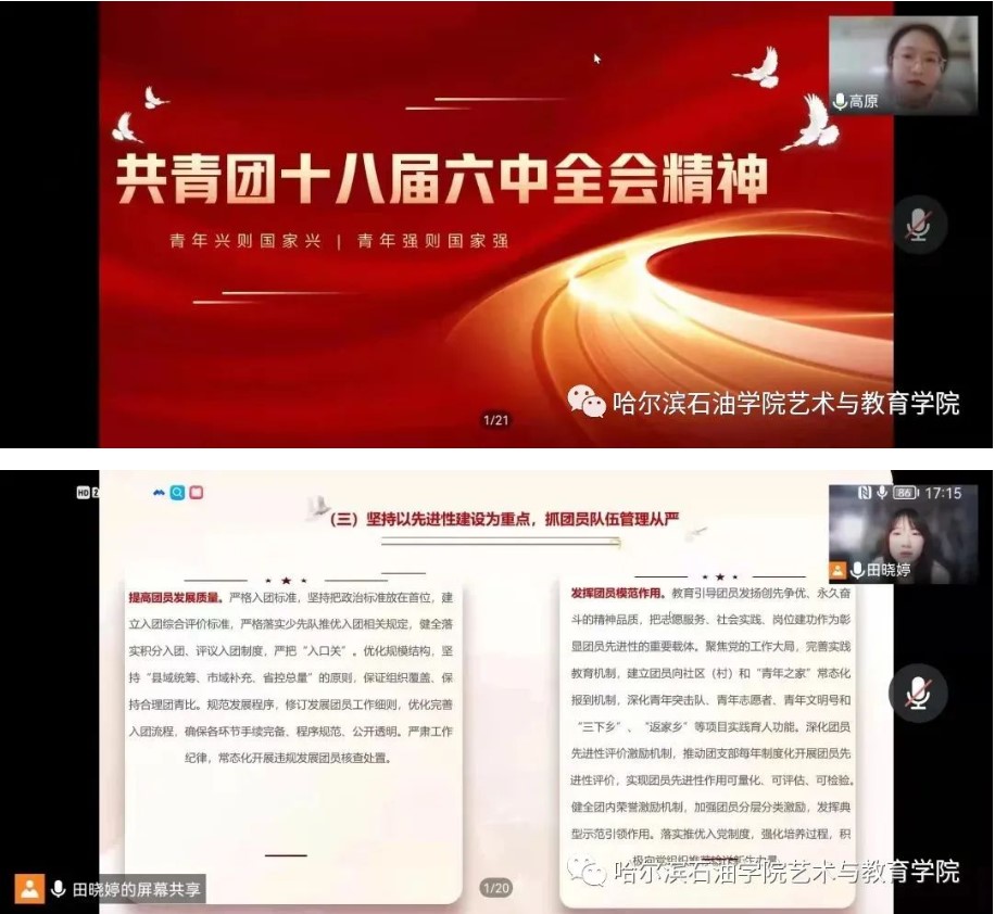 为了提高学团干部综合素质,进一步细化团学干部工作内容,更好的推动团支部及学院各项工作的顺利进行,以实际行动迎接党的二十大胜利召开。艺术与教育学院团总支于2022年4月2日于线上开展团学干部理论学习会,全体团学干部参加了此次会议,此次会议由艺术与教育学院团总支副书记高原、田晓婷主持。