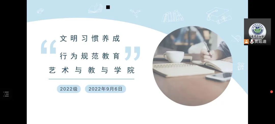 为进一步加强院风院纪建设,规范学生日常行为,增强学生对学校规章管理制度的理解,形成自觉遵守校规校纪的良好风气,推进文明校园建设,艺术与教育学院于2022年9月6日组织全体2022级新生开展新生入学教育——文明习惯养成行为规范教育活动。本次教育活动由2022级辅导员贾延迪担任主讲人,2022级全体新生参加了此次活动。