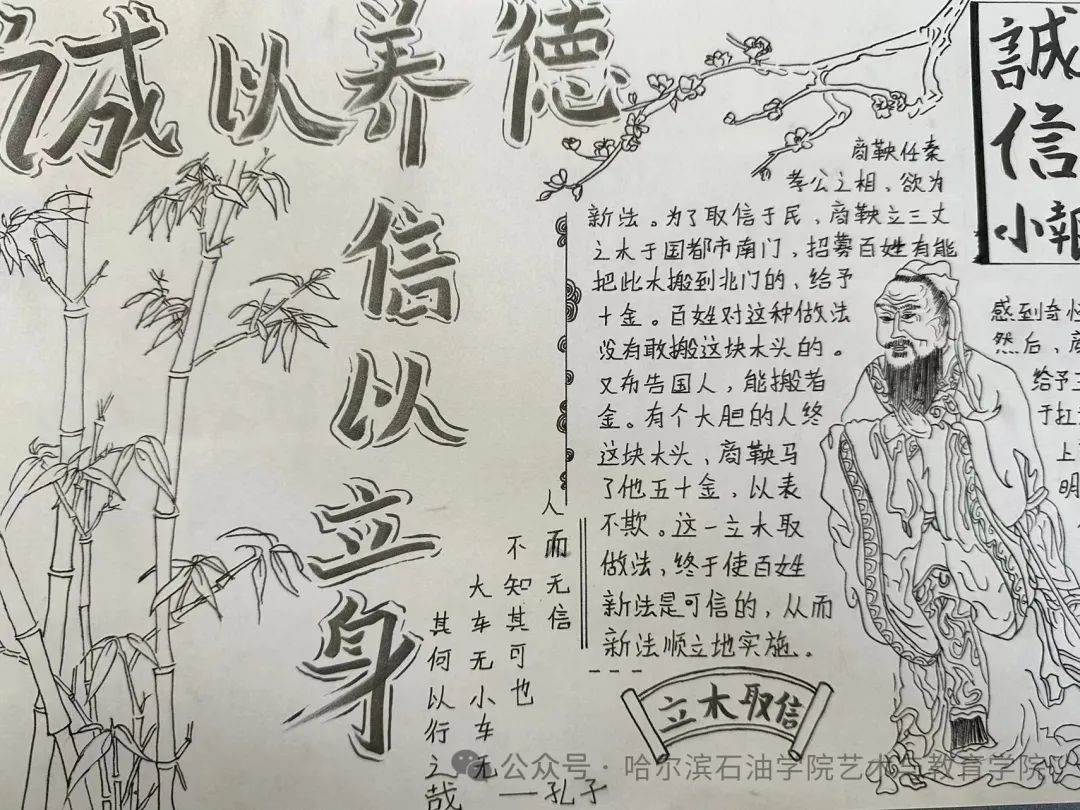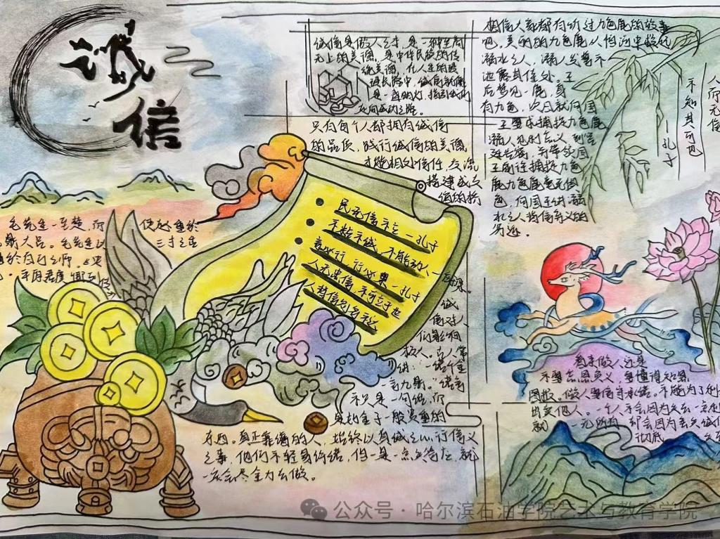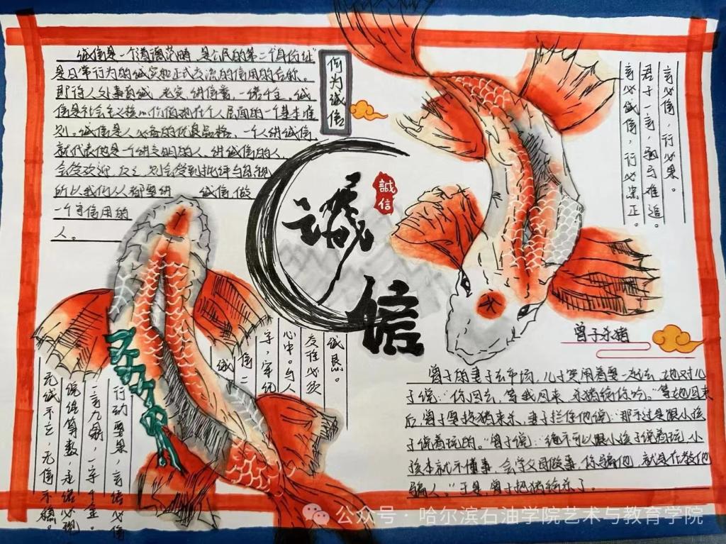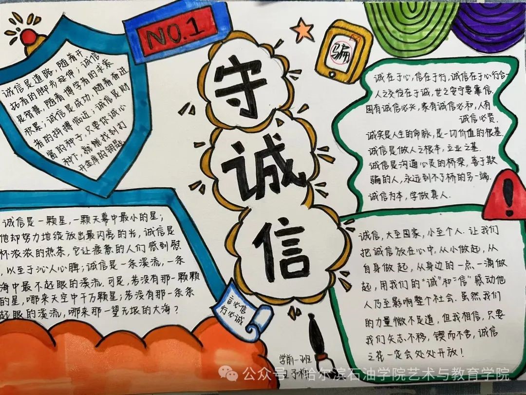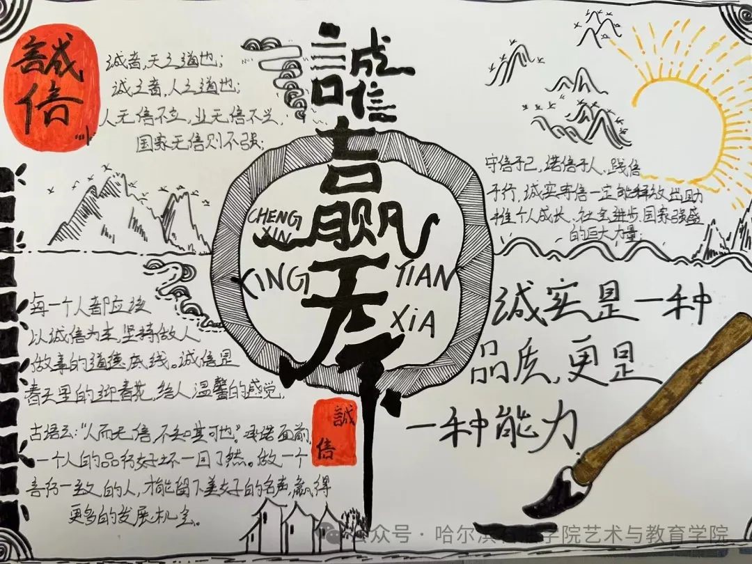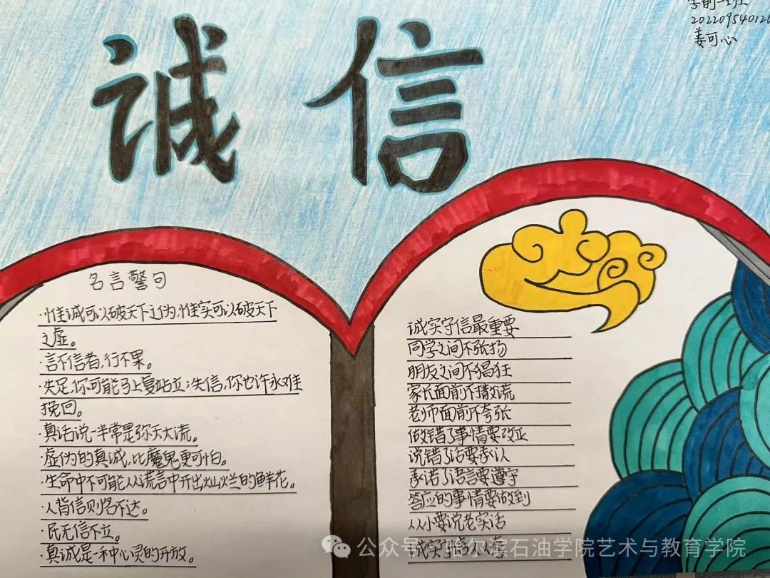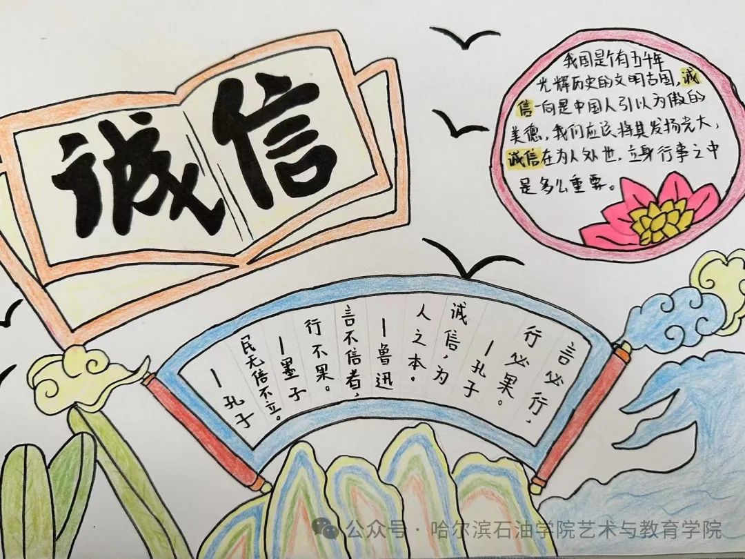 诚信是中华民族的传统美德,也是现代社会文明进步的重要标志。为了弘扬诚信精神,提高广大学生对诚信的认识和重视,引导学生树立诚信理念,培养诚信品质,激励学生以诚立世的奋发精神,营造积极、诚实、守信的文明之风,艺术与教育学院开展“心存诚信,处处感恩”手抄报绘画活动。