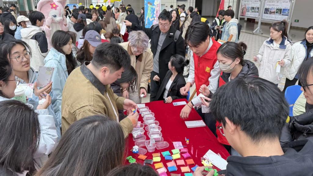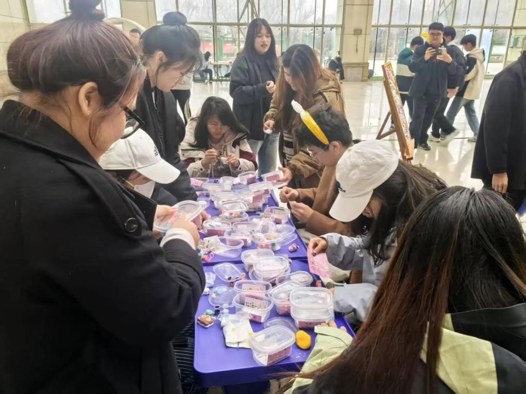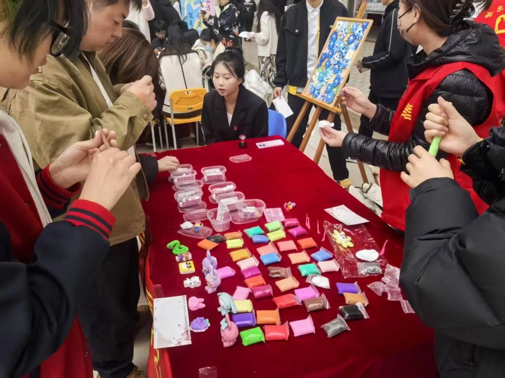 活动现场热闹非凡,石膏娃娃与超轻黏土相映成趣。不同于传统绘画,参与者可自由选用学院提供的丙烯颜料或黏土进行创作。有的为娃娃设计星空渐变裙摆,有的用黏土捏制憨态可掬的小动物,色彩斑斓的作品在指尖绽放,欢声笑语中,压力悄然消散。同学们在创作中找到内心的宁静,彼此交流心得,分享快乐。