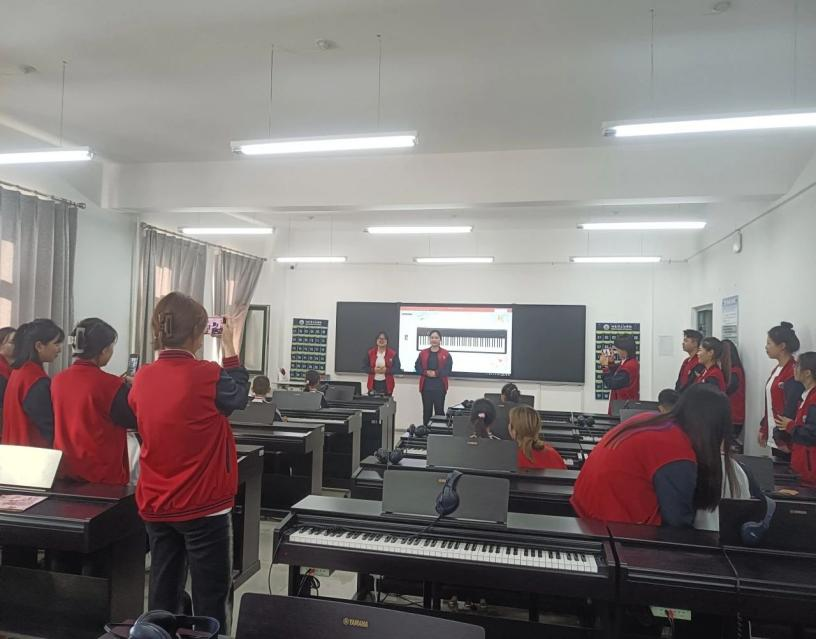 声乐弹唱组成员在滕美伊老师和王静竹老师的带领下,由2021级小老师教授小学生们学习弹唱儿童歌曲《小星星》,带领小学生们对钢琴演奏有了更深入地了解。