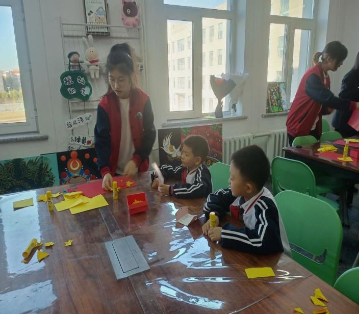 美工组成员在刘雪老师和王汝慈老师的带领下,由2021级小老师们教授小学生们动手制作“五星红旗”,并和自己的作品拍照合影,通过本次活动,让小学生们了解国旗的由来,进行了一次生动的爱国主义教育。