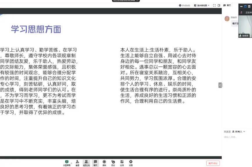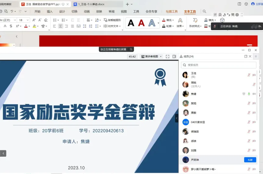 首先,主持人周铭根据《伟德bv国际体育学生手册》宣读国家励志奖学金评选流程、评选办法及评选条件。随后51名国家励志奖学金候选人按照顺序,结合PPT对上一学年个人在学习、思想、工作及生活等方面的综合表现,依次进行了个人陈述和答辩。同学们不仅学习成绩优异,在思想道德、志愿服务、个人获奖情况及工作生活中都表现突出,展现出自身风采,在班级同学中起到一定的带头作用。