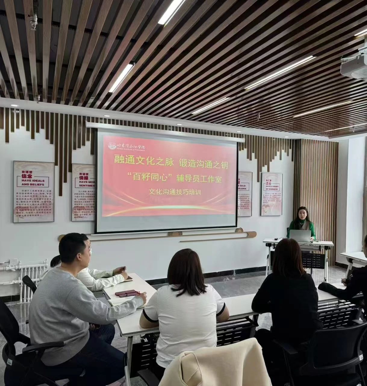 为进一步提升辅导员与少数民族学生之间的沟通效能,深化民族团结教育,2025年4月27日,“百籽同心”民族团结教育辅导员工作室开展以“融通文化之脉,锻造沟通之钥”为主题的文化沟通技巧培训会。本次培训会由工作室成员王素君主讲,工作室全体成员参加。