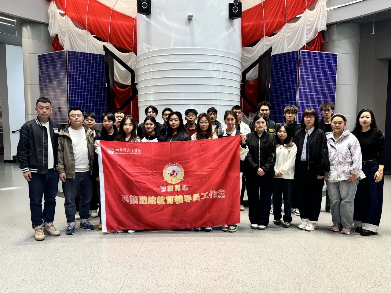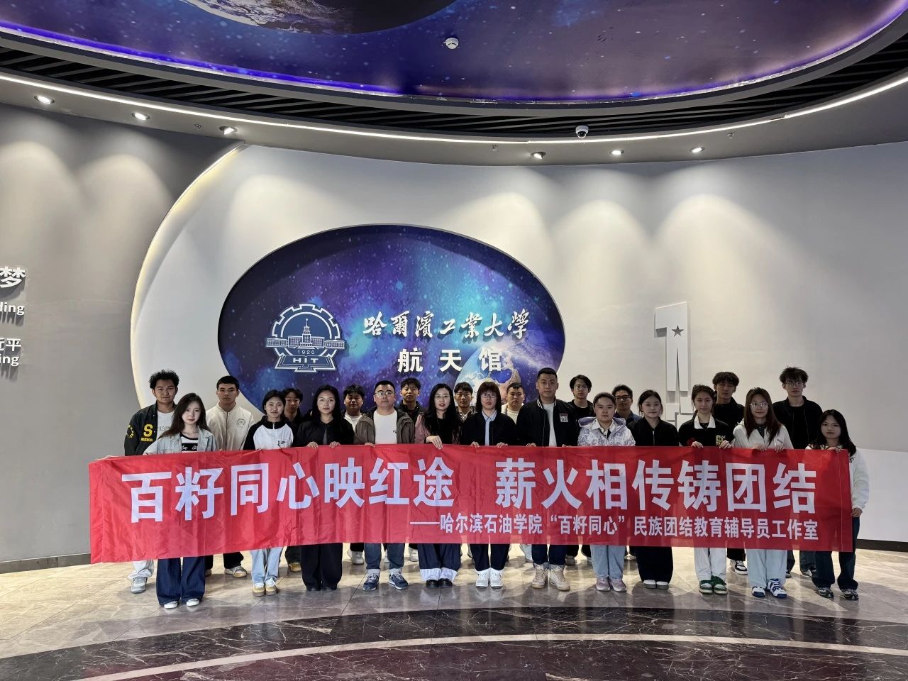 为深入贯彻落实习近平新时代中国特色社会主义思想与党的二十大精神,进一步铸牢中华民族共同体意识,强化各民族学生的爱党爱国情怀,深刻领悟中国共产党人精神谱系中“载人航天精神”的深刻内涵,4月29日,“百籽同心”民族团结教育辅导员工作室精心组织了一场意义非凡的研学活动,带领各民族学生代表共20余人走进哈尔滨工业大学航天馆,开启了一场探寻航天奥秘、汲取精神力量的研学之旅。