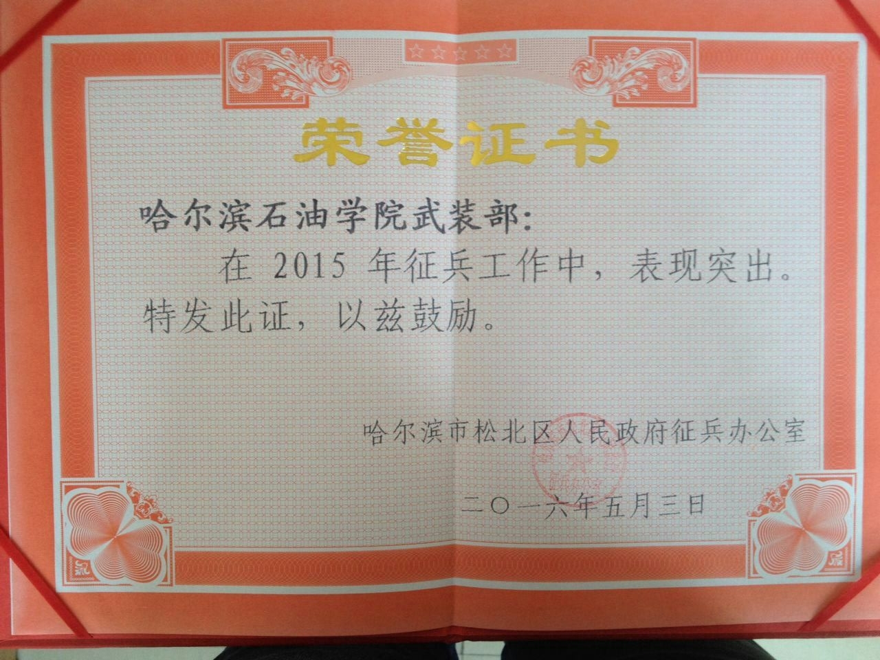 2016年5月5日,哈尔滨市松北区人民武装部召开2015年征兵工作总结表彰大会及2016年征兵工作部署动员会。会上分别由松北区副区长、松北区人武部部长及政委做重要指示。