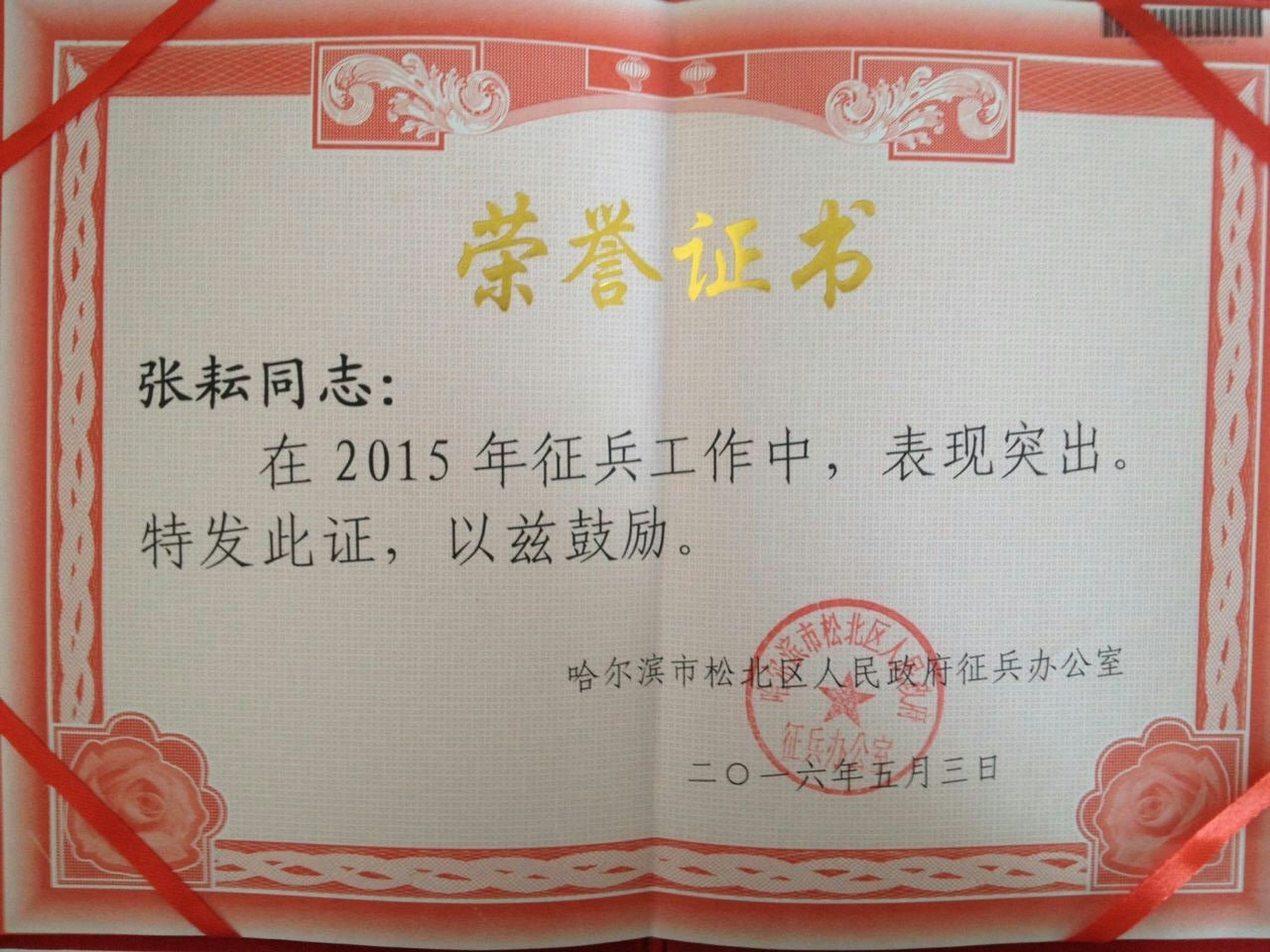 伟德bv国际体育人民武装部在2015年征兵工作中表现突出给予绩效奖励表彰,获评先进人武部,张耘同志荣获先进个人。
