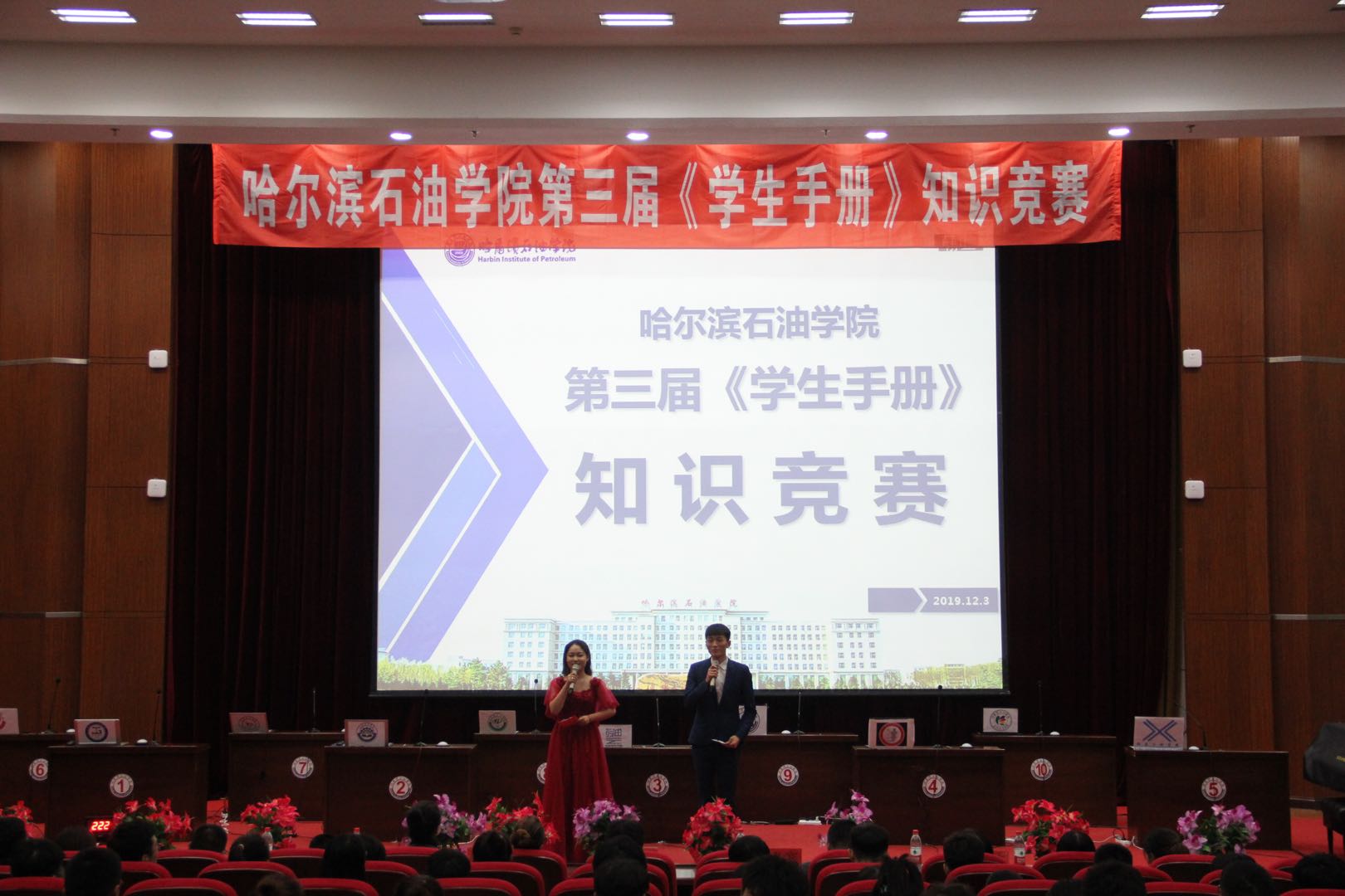 为进一步加强伟德官网学风建设,促进广大学生对学校各项规章制度的学习、掌握和践行,增强学生“自我教育,自我管理,自我服务”的意识,由伟德bv国际体育校学生工作处主办,校学生总会承办的,“知校规,明校纪,讲文明,促学风”《学生手册》知识竞赛于12月3日在图书馆报告厅举行。校党委副书记、副校长杨宏,学生工作处处长宁晶,石油工程学院党总支书记刘雁春,校团委副书记彭雷,保卫处副处长张学斌,信息工程学院党总支副书记张宏鹏,学生工作处副处长李长城,公寓管理部科长金梅及各学院团总支书记、学团办公室主任、辅导员出席了本次活动。各学院600余名学生代表观看了本届知识竞赛。