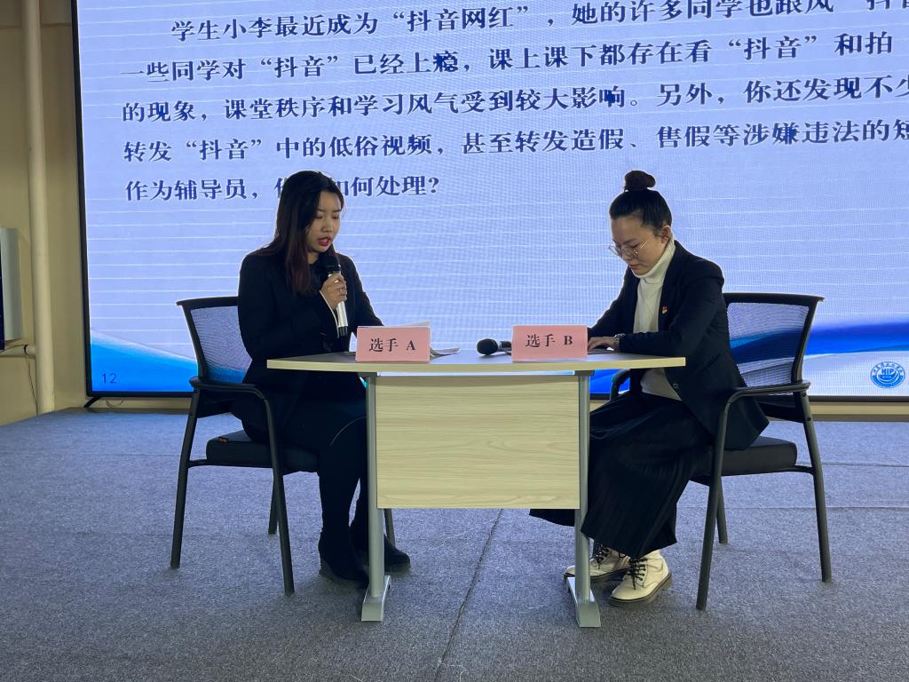 赛前十位辅导员两两抽签成组。各位参赛选手,根据所抽案例,就辅导员工作中涉及的理想信念教育和价值引领、学风建设、危机事件应对与处理、稳定安全教育管理、学业指导、就业指导、党团班级建设等各类工作内容,一同辨析原因、探讨对策、总结规律。本届大赛案例研讨环节,打破以往单向性、程式化、表演式的比赛方式,采用“你提问,我回答”的方式进行案例研讨,充分展现了伟德官网辅导员素质能力大赛在不断革新中体现出的群众性、示范性、互动性、差异性和引领性。深化伟德官网辅导员对学生工作实际问题的认识和理解,提升解决实际问题的素质和能力,反哺工作实践,增强育人本领,增进育人实效。