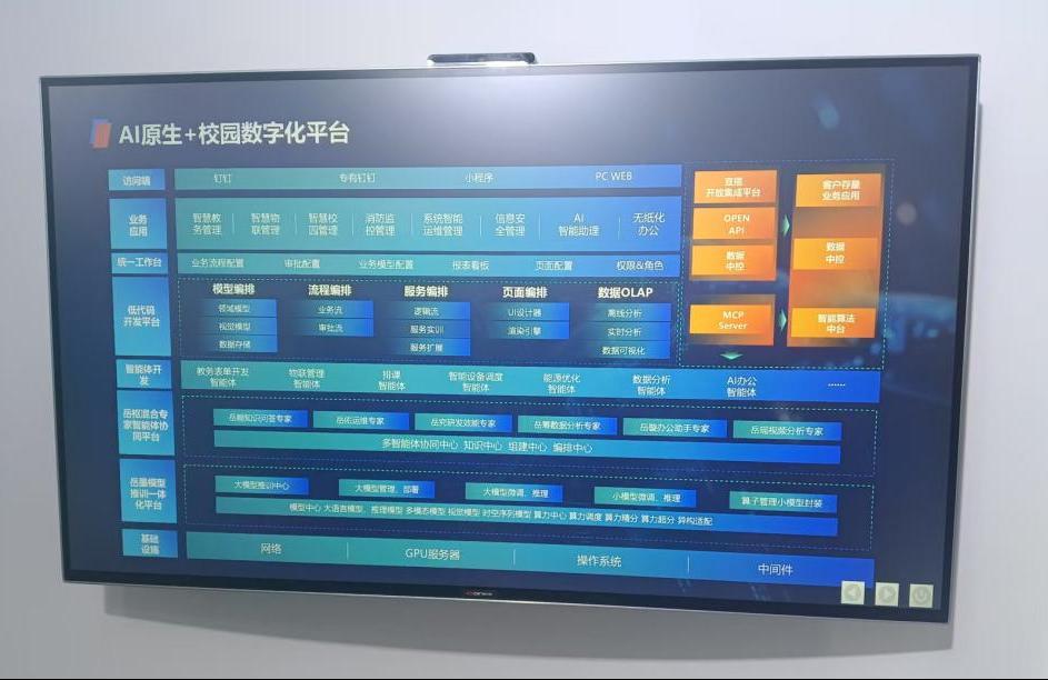 在“AI原生 + 校园数字化平台”上,鲍主任深入了解平台在智慧教务管理、智慧物联管理、消防监控管理、系统智能运维管理等多个校园场景中的应用。该平台构建了涵盖业务应用层、统一工作台层、低代码开发平台层、智能体开发层等多层架构。通过智能算法中台与多智能体协同中心,实现了校园管理从传统模式向智能化、自动化的跨越,充分展现了人工智能与校园数字化深度融合的巨大潜力。