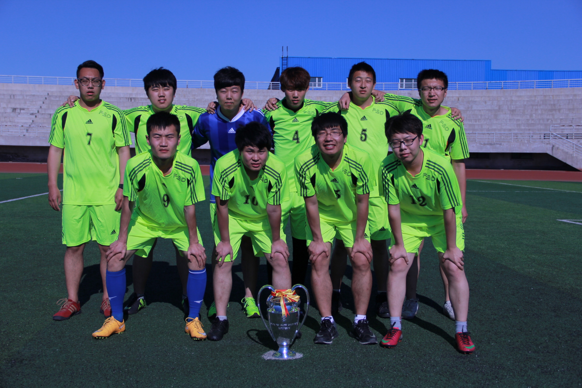 在决赛中,球员们意气风发,斗志昂扬,争先恐后,来回传球。每一位球员都毫不示弱,尽显男儿本色。赛区内球一次次逼近球门,一次次被守门员及时拦下;球场外同样高潮迭起,精彩赛况引发同学们的阵阵欢呼。上半场信息队利用快速反击打入一球,下半场自控队利用直接任意球扳平比分,两支队伍实力相当,不分上下,各有各的优势,1:1的比分被保持到了终场结束。随着主裁判的一声哨响比赛进入到了扣人心弦的点球大战,最终信息工程与计算机技术系足球队以4:3的比分捧得冠军奖杯,在胜利的欢呼和呐喊声中本次阳光体育节足球比赛也圆满的落下了帷幕。