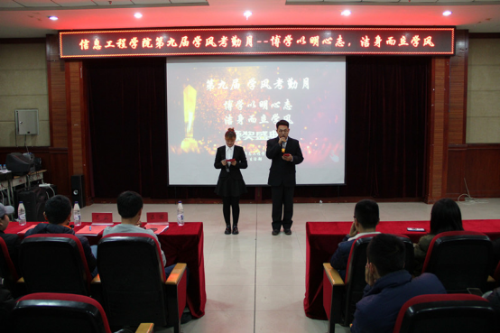 学风考勤月在一个月的时间内对同学们的上课出勤、早操、晚自习、寝室卫生等情况用量化的方式体现出来,由专门的 部门进行每天考核打分,于当晚评选出了获得学风考勤月活动期间的优秀个人、标兵寝室等荣誉称号的团体,孙朝阳,宫雪薇两位同学以出色的表现获得标兵个人;任笑抒,宋昊阳同学获得优秀个人;433,335寝室获得标兵寝室称号;412,309获得优秀寝室称号,为鼓励同学们继续努力,信息工程学院领导人为获奖人员颁奖。