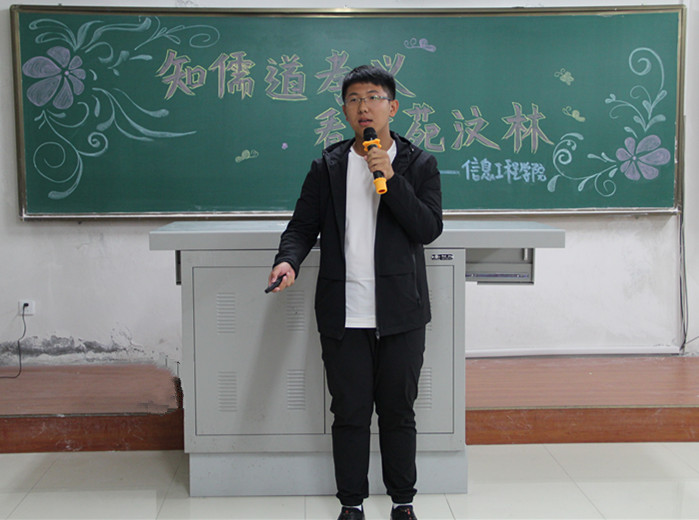 为了纪念建国67周年并大力弘扬中华传统文化精髓,深化学院文化内涵,丰富学院文化气氛。信息工程学院于2016年9月29日在二教401举行了以“知儒道孝义,看学院汶林”的大型主题演讲活动。参加此次活动的嘉宾有信息工程学院党总支副书记苏永彬老师,辅导员张宏鹏老师以及2016级全体学生。