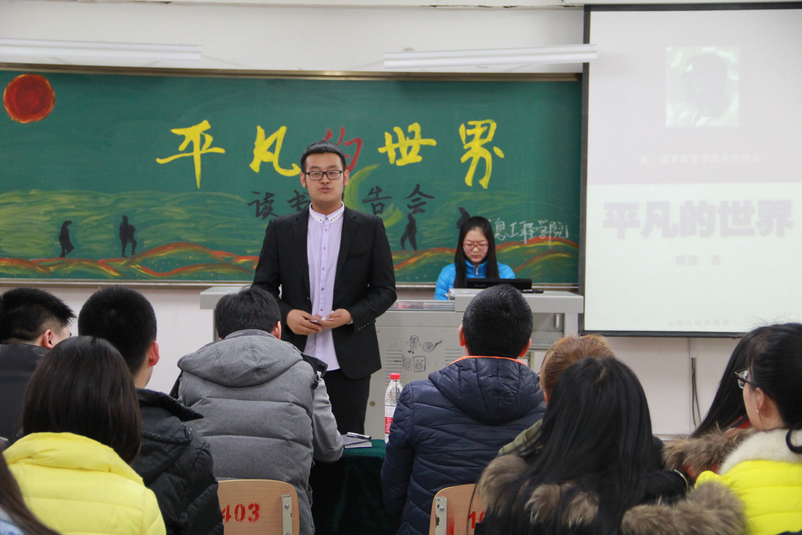 一部作品会照亮你的人生,一个人的精神会成为你的信仰。这就是路遥和他的《平凡的世界》。信息工程学院党总支副书记苏永彬老师为所有学生干部们布置了一个有意义的寒假作业,观看《平凡的世界》。并于2016年3月10日在第二教学楼407开展了《平凡的世界》读书报告会。