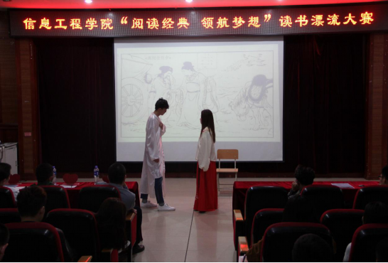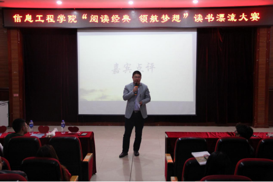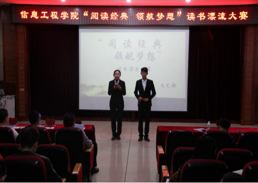 活的读书笔记,演绎精彩人生。为了提高同学们的读书兴致,养成好的读书习惯。信息工程学院于4月27晚5:30在主教518举行了“阅读经典,领航梦想”读书漂流大赛,学院党总支书记毛雷,团总支副书记李世民以及16届学生会主席团成员担任了本次活动的评委。