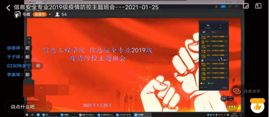 会议采用线上网络平台,通过腾讯会议app、钉钉会议等形式召开,会上各辅导员老师向全体学生传达《致全校师生员工的一封信》,并结合重要内容进行解读,特别强调每个人都是自己健康的第一责任人。要继续加强新冠肺炎预防措施、坚持“非必要,不出门”原则,一旦出门,保证不聚集、佩戴口罩、做好通风消毒、勤洗手、打喷嚏时掩口鼻等相关措施。寒假居家期间,要求同学们不参加聚会及大规模聚餐,主动防范进口冷链食品,继续加强新冠肺炎疫情的自我防护。