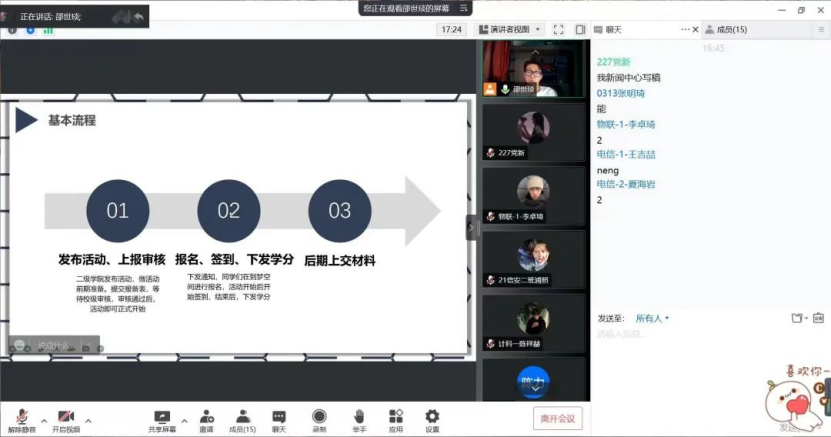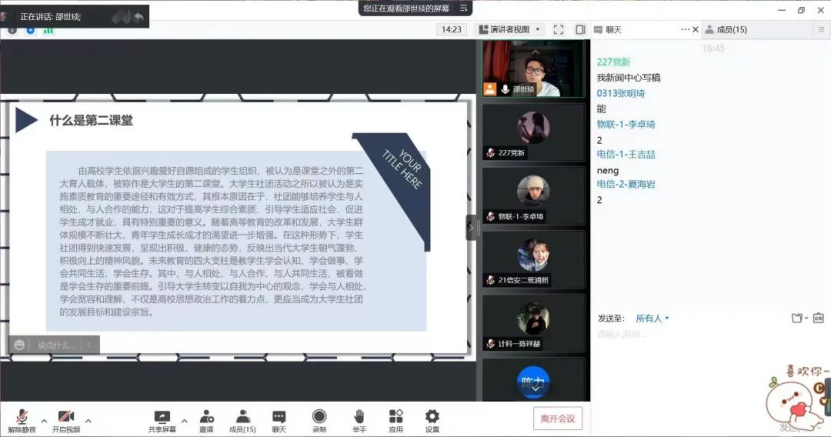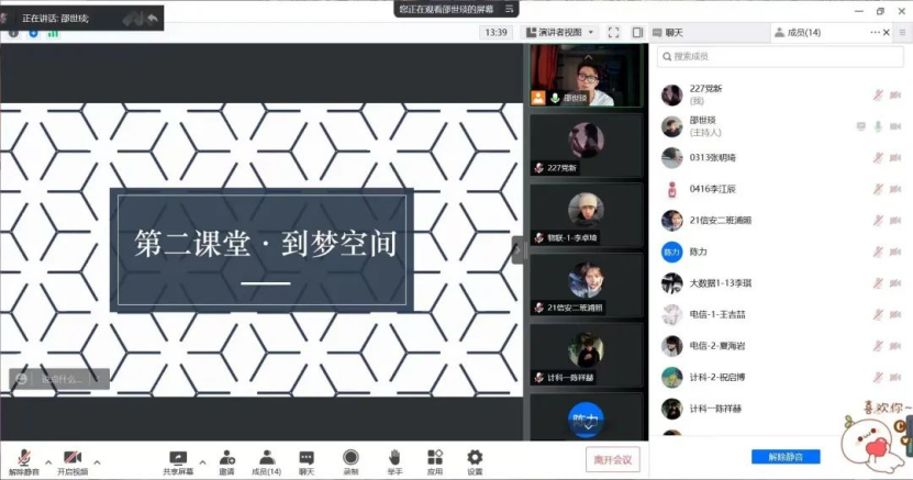 为进一步推进我院学生学业进程,充分发挥学生参与课外活动的积极性。让各班同学深刻认识到“第二课堂成绩单”的重要意义,将第二课堂作为第一课堂的有机补充和重要延伸,保证所有同学所获得的学分达到第二课堂毕业要求。信息工程学院于2022年5月10日下午五点整在腾讯会议开展了“第二课堂到梦空间”主题会议。本次会议由学生会成员邵世琰主持,21级各班班长参加。