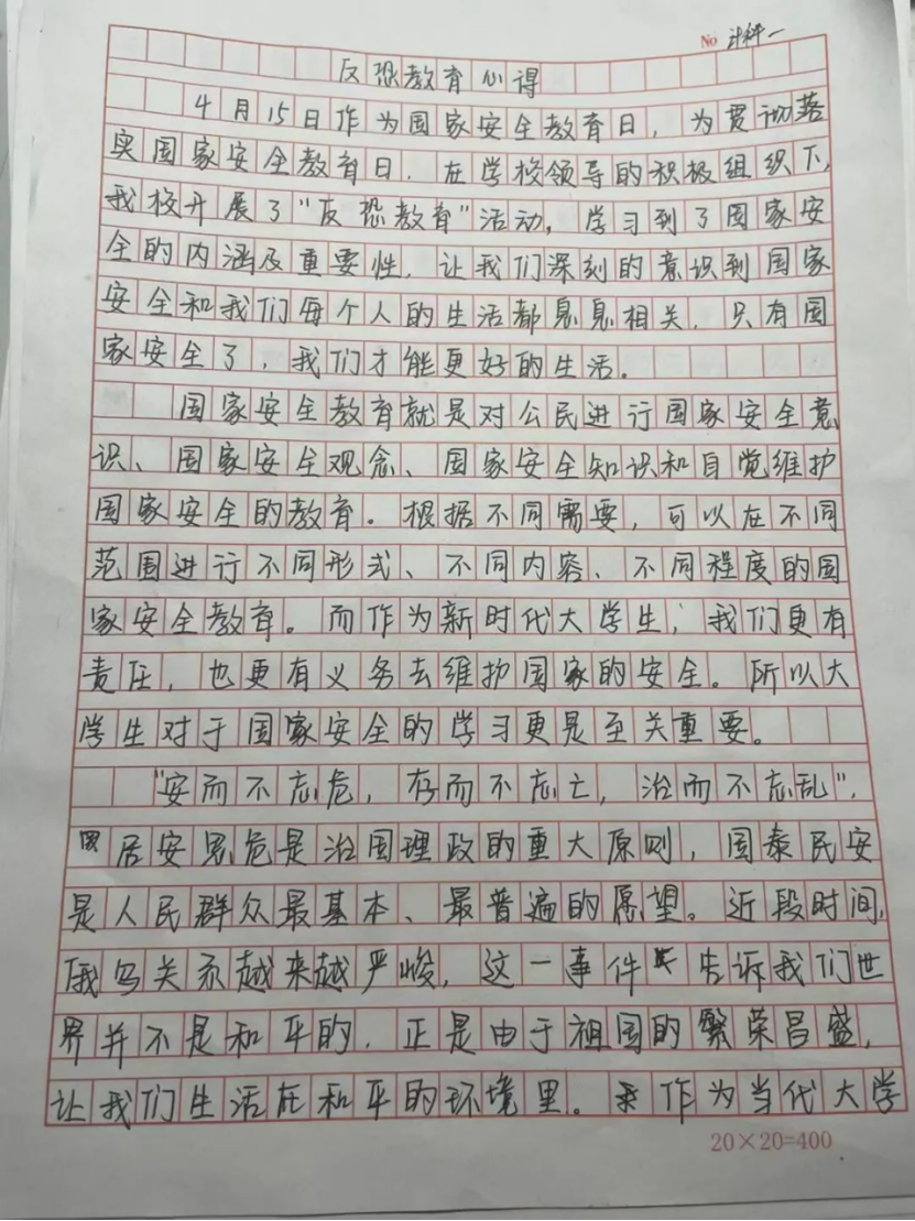 为宣传和普及防范恐怖袭击常识,使广大学生在发生恐怖袭击时,积极采取正确措施规避危险,信息工程学院于2022年4月10日于线上视频的形式,组织开展了以“树牢总体国家安全观,感悟新时代国家安全成就,为迎接党的二十大胜利召开营造良好氛围”为主题的反恐宣传教育活动,活动结束后学生们纷纷表示对本次活动的开展深有感悟。