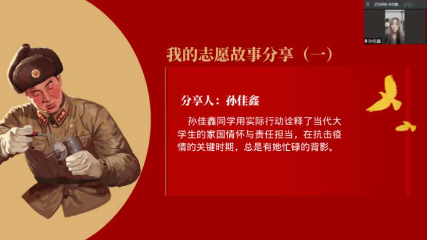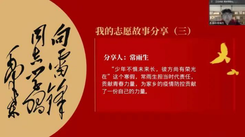 会议中,四位志愿者分享了他们利用寒假实践,积极地参与到社区疫情防控志愿队伍中,遇见了一件又一件感人暖心的故事,以及许多前辈在抗疫前线无私奉献的所见所闻。志愿者们这些难忘的人生经历与人生感悟,让同学们深感人间温暖。