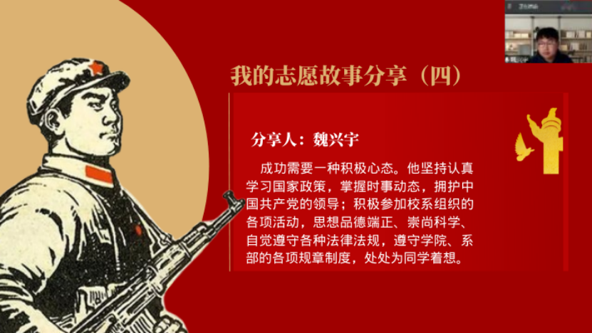 为迎接党的二十大胜利召开,继续发扬雷锋精神,全面贯彻落实雷锋活动月工作精神,大力弘扬志愿服务精神,信息工程学院于2022年3月29日下午五点在腾讯会议线上开展以“学习雷锋精神,树立文明新风”为主题的志愿服务故事分享会,我院全体同学参会。