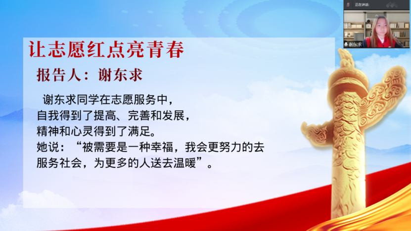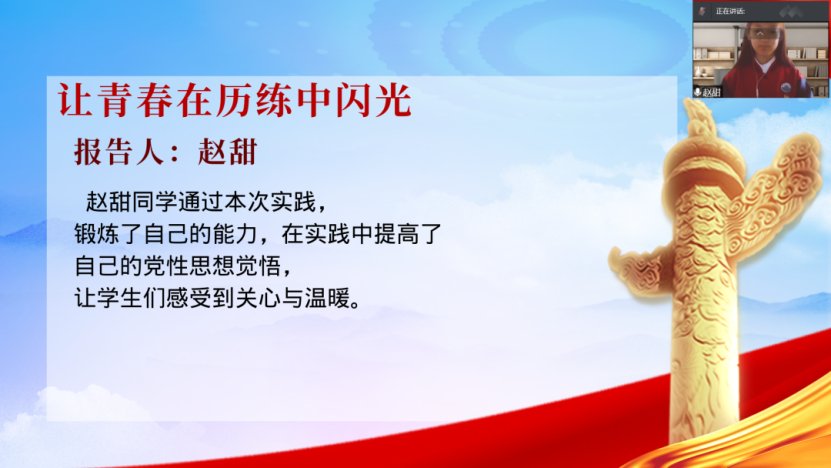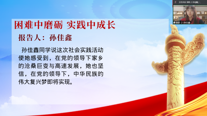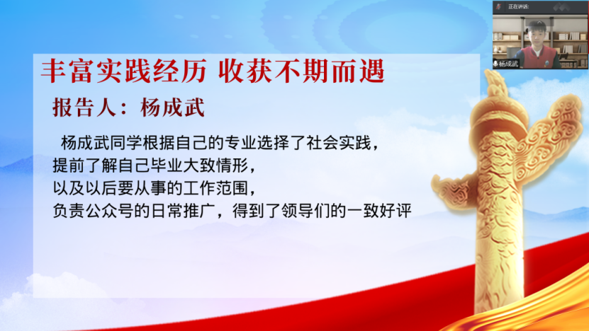 会议中,依次邀请了本次社会实践报告会获奖者同学以及部分优秀学生代表,有序进行向大家分享了个人的实践经历和心得体会,“知之愈明,则行之愈笃;行之愈笃,则知之益明。”大学生社会实践作为高等院校实践教育的组成部分,社会实践使同学们找到了理论与实践的最佳结合点,它给生活在象牙塔中的同学们提供了广泛接触基层、了解社会的机会。