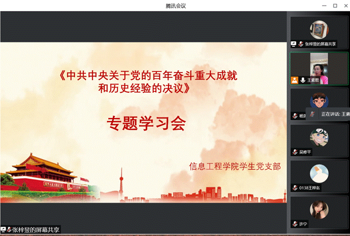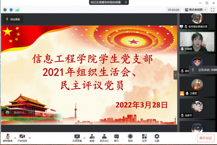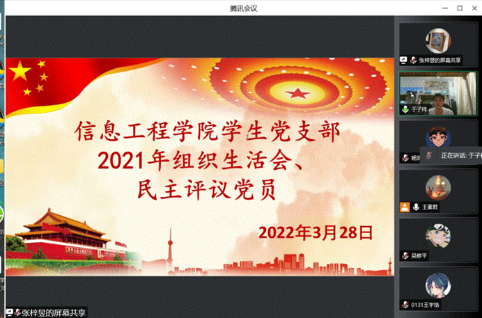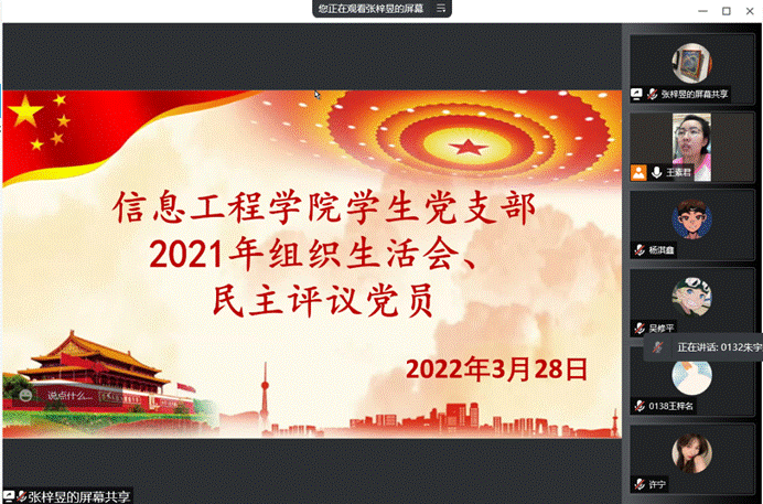 为深入学习贯彻习近平新时代中国特色社会主义思想,全面提高学生党员的政治素质,严格执行党的组织生活制度,信息工程学院学生党支部于2022年3月28日18:30在腾讯会议上组织召开了2021年度组织生活会暨民主评议党员大会。本次会议由信息工程学院学生党支部书记王素君主持,我院全体学生党员参加。