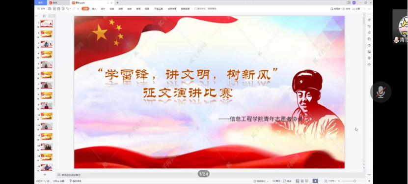 三月,万象更新,热情洋溢,为进一步推动“雷锋月”活动的深入开展,信息工程学院于2022年3月25日下午5点30分在腾讯会议上举行了“学雷锋,讲文明,树新风”征文演讲比赛,信息工程学院团总支书记王素君、21级辅导员王天骥、21级辅导员宋楠楠、各部门的部长及其成员出席本次活动。