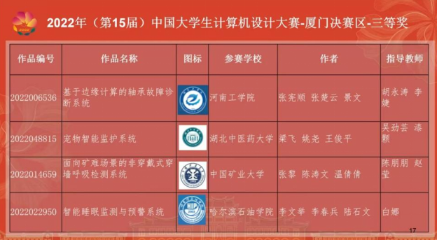 近日,由中国大学生计算机设计大赛组织委员会主办,中国大学生计算机设计大赛厦门决赛区组委会协办,厦门大学、物联中国团队组织联席会承办,厦门大学电子科学与技术学院、厦门市物联网行业协会实施的“2022 年(第 15 届)中国大学生计算机设计大赛国赛 厦门决赛区”落下帷幕,本次大赛中,开放创新实验室参赛团队,以高质量的项目内容,在黑龙江省赛中表现优异,最终进入国赛,与电子科技大学、北京邮电大学等高校竞争荣获佳绩。