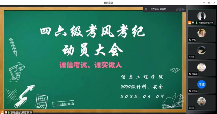 二、国家考风考纪动员大会。对于即将到来的四六级英语考试,我院考生学子应形成良好的考试纪律,树立良好的学风,确保考试质量,提高考试的社会信誉,严肃考风考纪,树立良好的学习风气,是维护教育考试信誉、选拔优秀合格人才根本的所在。“诚信做人 诚信考试”考试不仅将检测考生的学习成果,本身也是对考生诚信的考验,良好的考风考纪,是一个学校形象的象征,同时也是作为我们信息工程学院中一员的诚信体现,作为一名新时代大学生,应严于律己,言行一致,作业和考试中求真求实,不抄袭、不作弊,以诚信做人作为新时代青年学子立足于社会的准则。