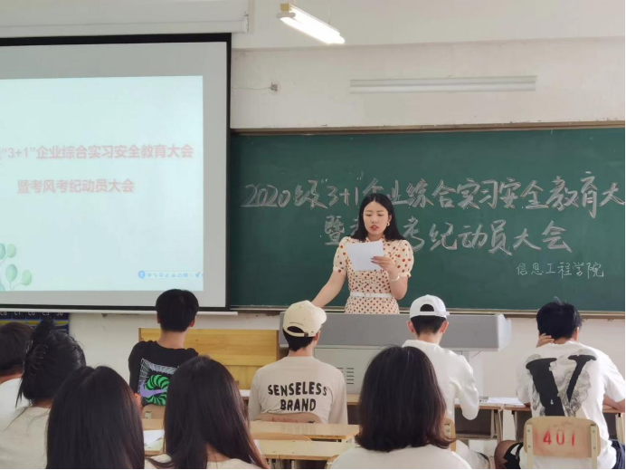 为提升我院学生“3+1”企业综合实习的质量与水平,确保2020级同学实习任务能够圆满完成。加强我院2020级学子们在实习期间的安全防范意识,提高同学们的安全防范能力。信息工程学院团总支书记、20 级辅导员王素君,20 级辅导员高雅茹共同带领2020级全体同学组织开展了2020级“3+1”企业综合实习安全教育主题班会。