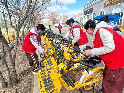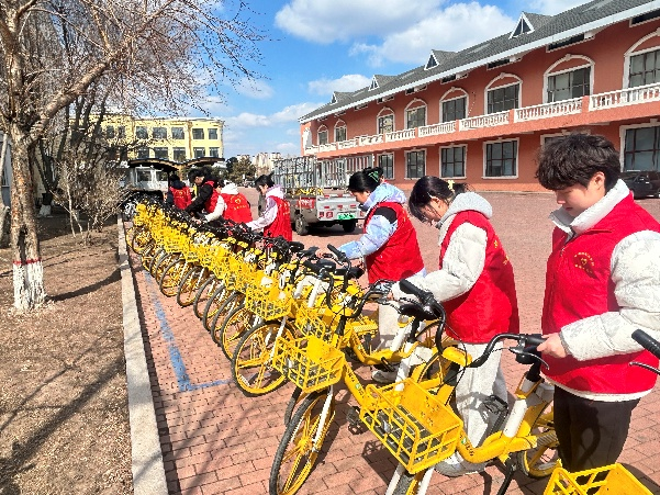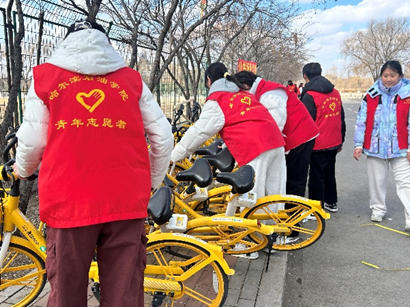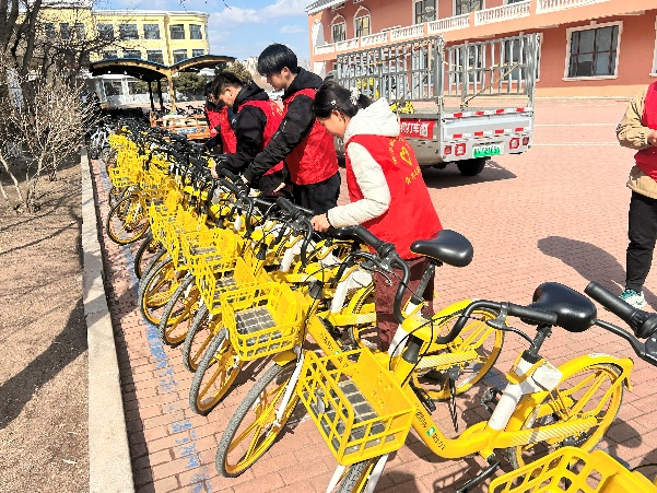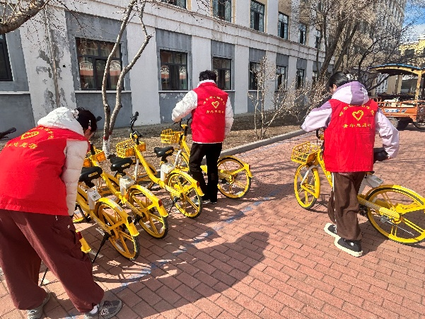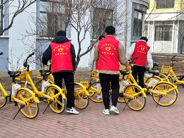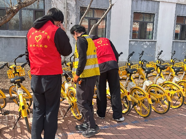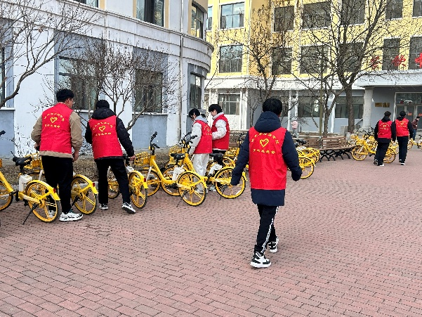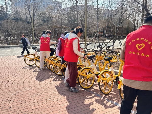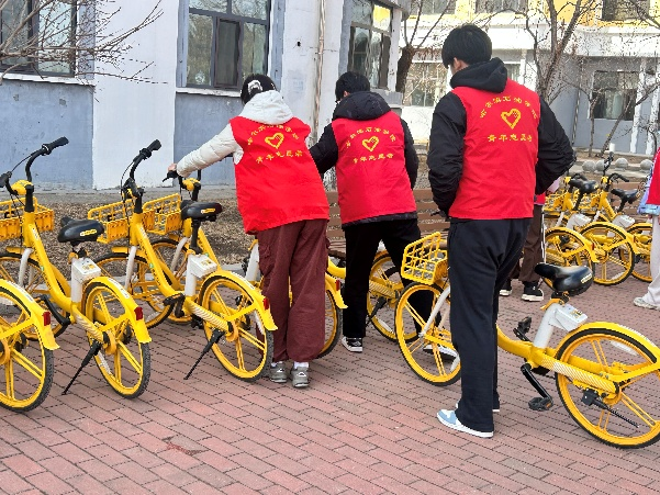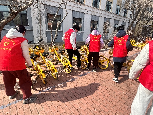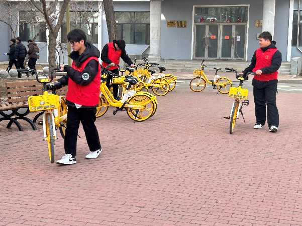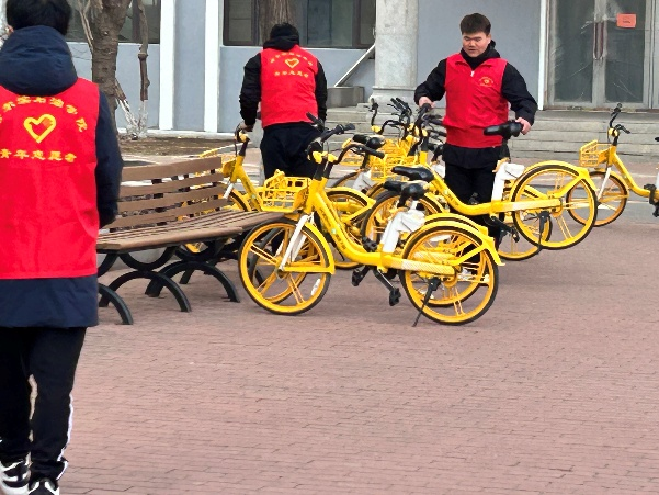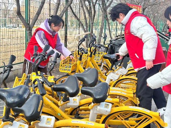 活动当日,志愿者们来到校园共享单车停放点。面对杂乱停放的共享单车,他们迅速分工,两人一组,有条不紊地展开整理工作。有的志愿者负责扶起倒地的单车,有的将随意停放的车辆推至指定停车区域,按照车头方向一致的标准,整齐排列。志愿者们热情高涨,干劲十足,他们的脸上洋溢着专注与坚定,以实际行动诠释着雷锋精神的内涵。