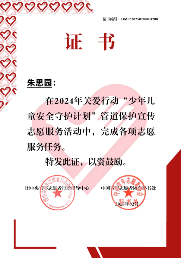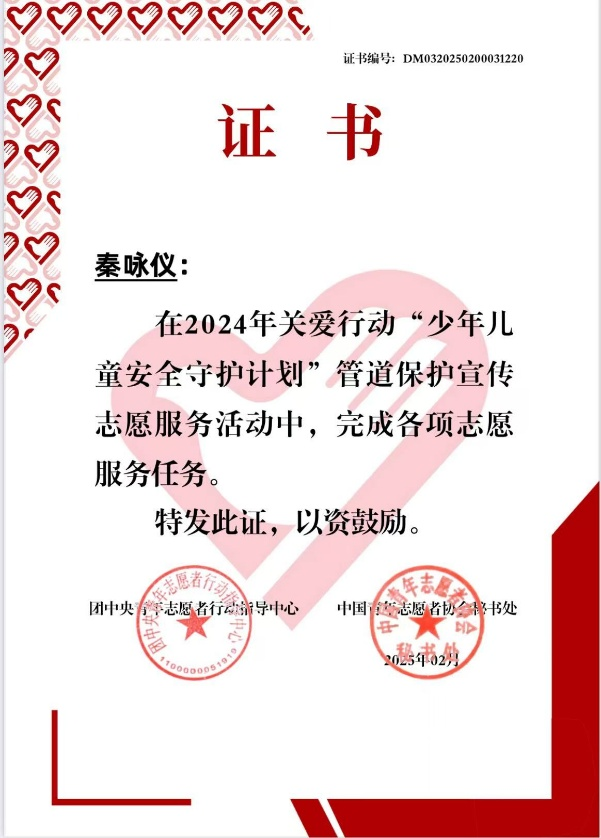 在2024年关爱行动“少年儿童安全守护计划”管道保护宣传志愿服务活动中,伟德bv国际体育信息工程学院青年志愿者协会的志愿者们,圆满完成各项志愿服务任务,荣获由团中央青年志愿者行动指导中心和中国青年志愿者协会秘书处颁发的荣誉证书!