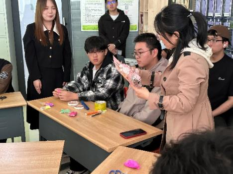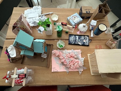 学生们大显身手,综合运用剪裁、折叠、拼贴、绘画等多种技法,将废旧材料变成了一件件兼具审美价值与实用功能的作品。有的学生用一次性筷子搭建出精致的立体雕塑,有的则用旧毛线为鸡蛋托“换装”,制成可爱的盆栽容器。这些作品不仅展现了学生们的艺术创造力,更成为他们释放压力、表达情绪的独特方式。