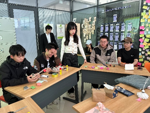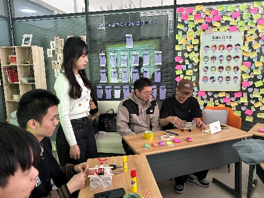活动前期,信息工程学院发布了活动预热通知,鼓励学生收集废品,如易拉罐、旧衣物、纸杯这类常见废弃物,还特别倡导大家带上承载情感记忆的废弃物品,为创作增添特殊意义。在创作方向上,学生们充分发挥想象力,将心理状态融入作品的形态与色彩之中,从把纸杯变成花瓣风铃,到用网状袋编织装饰品,创意层出不穷。