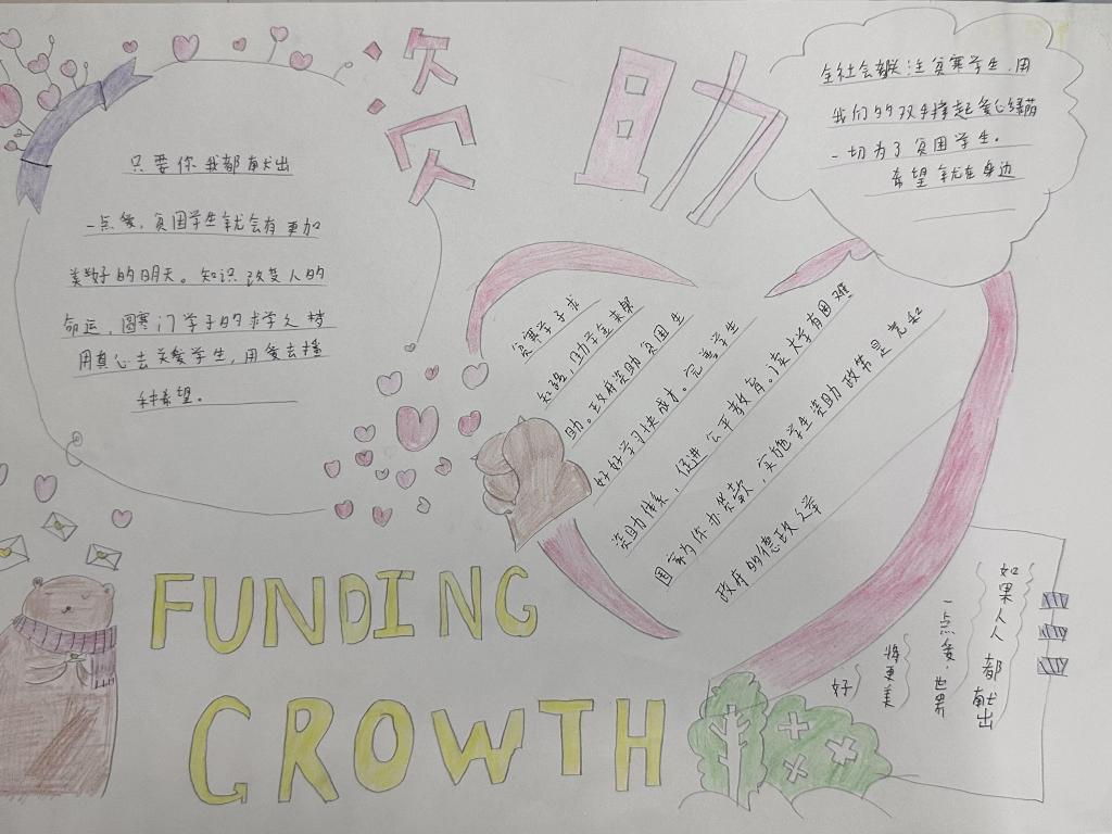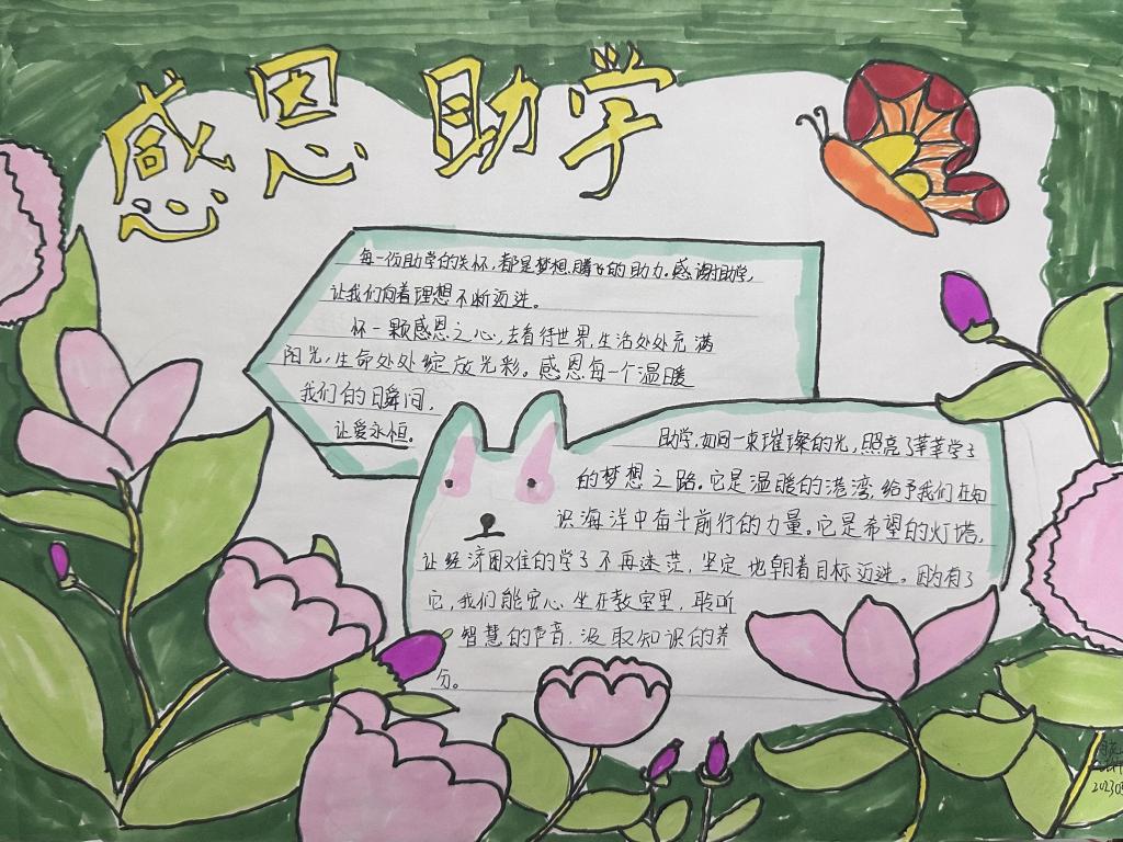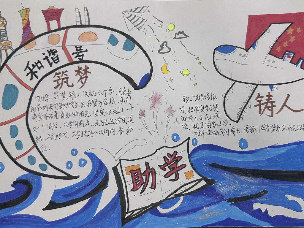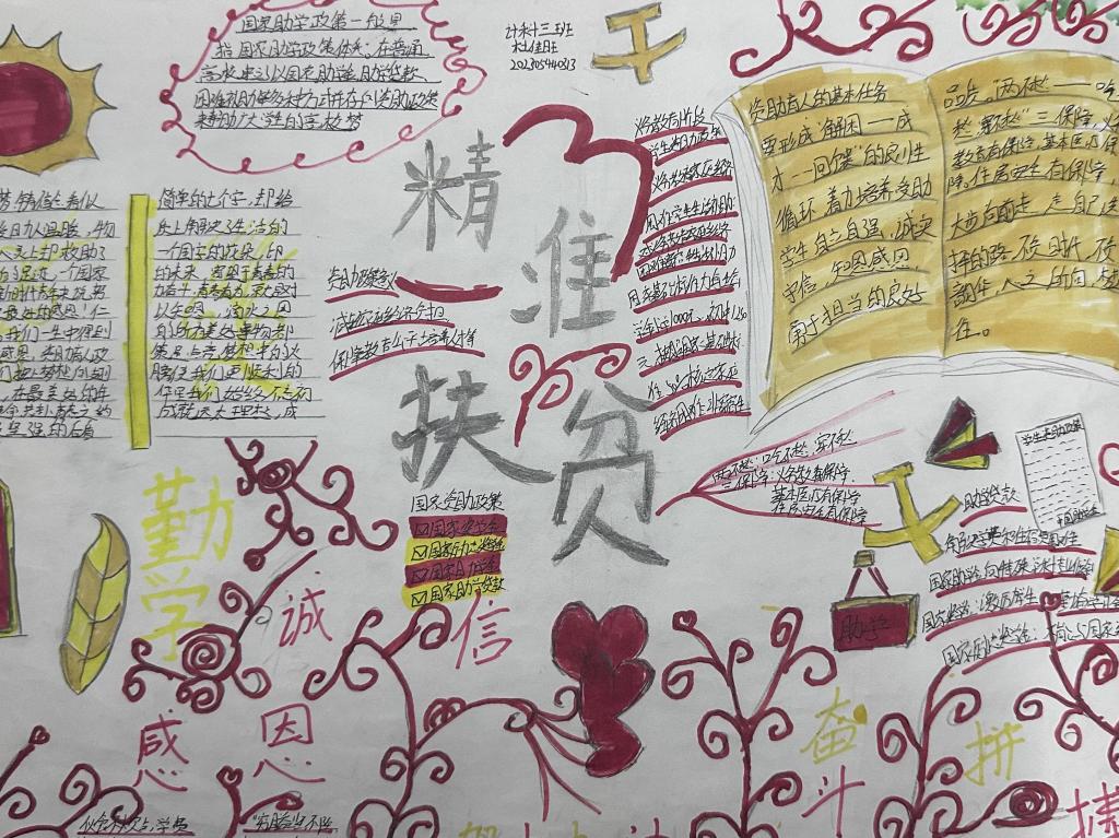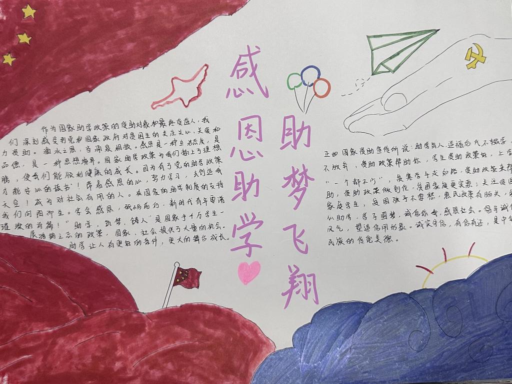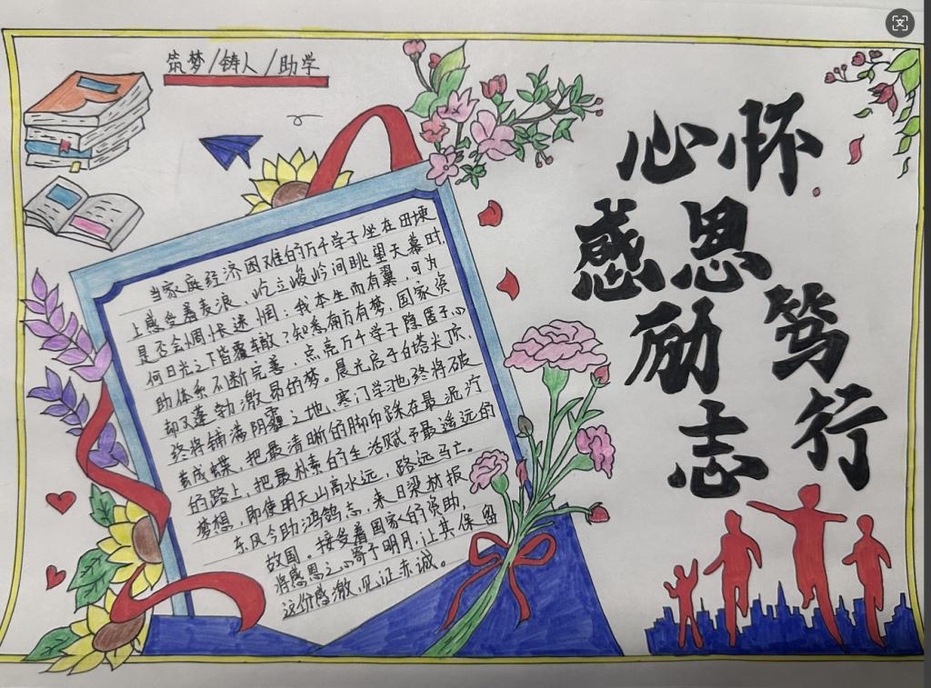 活动伊始,学院面向全体学生发起“助学主题手抄报创作大赛” 。同学们踊跃参与,围绕国家助学政策、感恩励志故事、逐梦青春感悟等内容,以笔为媒、以纸为介,将对助学温暖的感知、对未来梦想的憧憬,融入一幅幅色彩斑斓的手抄报中。有的同学以 “感恩助学 筑梦前行” 为主题,用细腻文字讲述受助心声,搭配象征希望的向日葵、纸飞机图案,传递积极向上的力量;有的同学聚焦 “助学铸魂” 内涵,梳理国家助学政策体系,结合校园助学实践,展现政策如何为学子铸牢理想信念之魂。