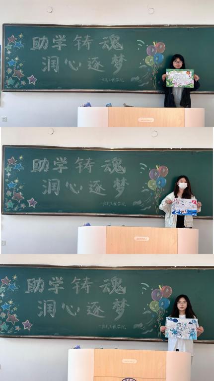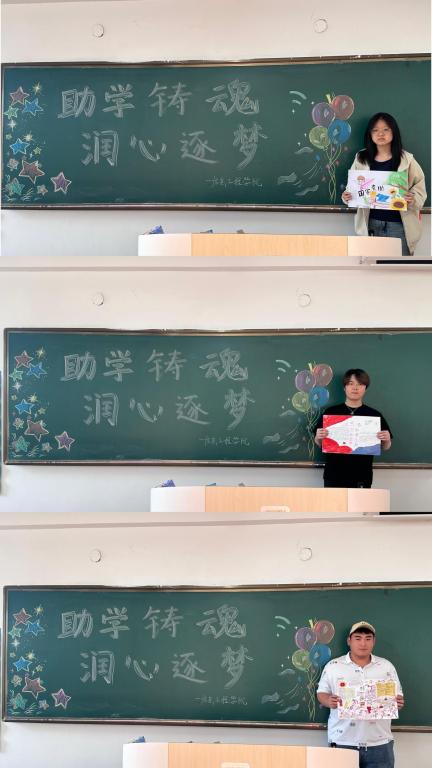 随后,学院组织“助学铸魂 润心逐梦”手抄报展示分享会。活动现场,黑板上“助学铸魂 润心逐梦”的主题标语格外醒目,同学们手持精心创作的手抄报,依次走上讲台分享背后的故事。